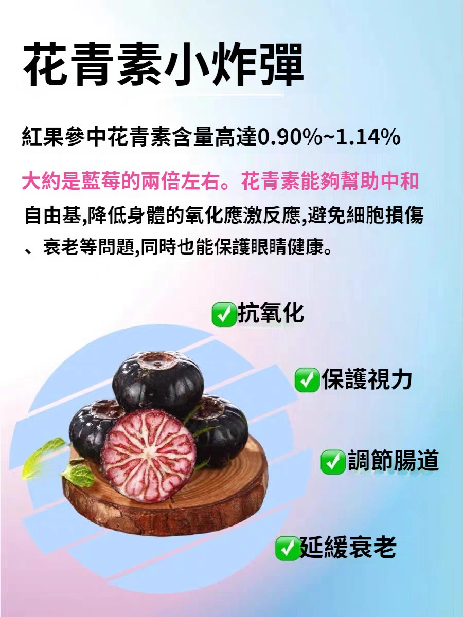 紅果參乾果、稀有當季精品水果、紅果參多醣被認為是其最重要的活性成分之一,能夠增強巨噬細胞的吞噬能力,​​促進淋巴球增殖,進而調節和增強身體免疫功能。 *·預抗腫瘤:一些體外研究和動物實驗表明,紅果參多醣對某些癌細胞有抑製作用