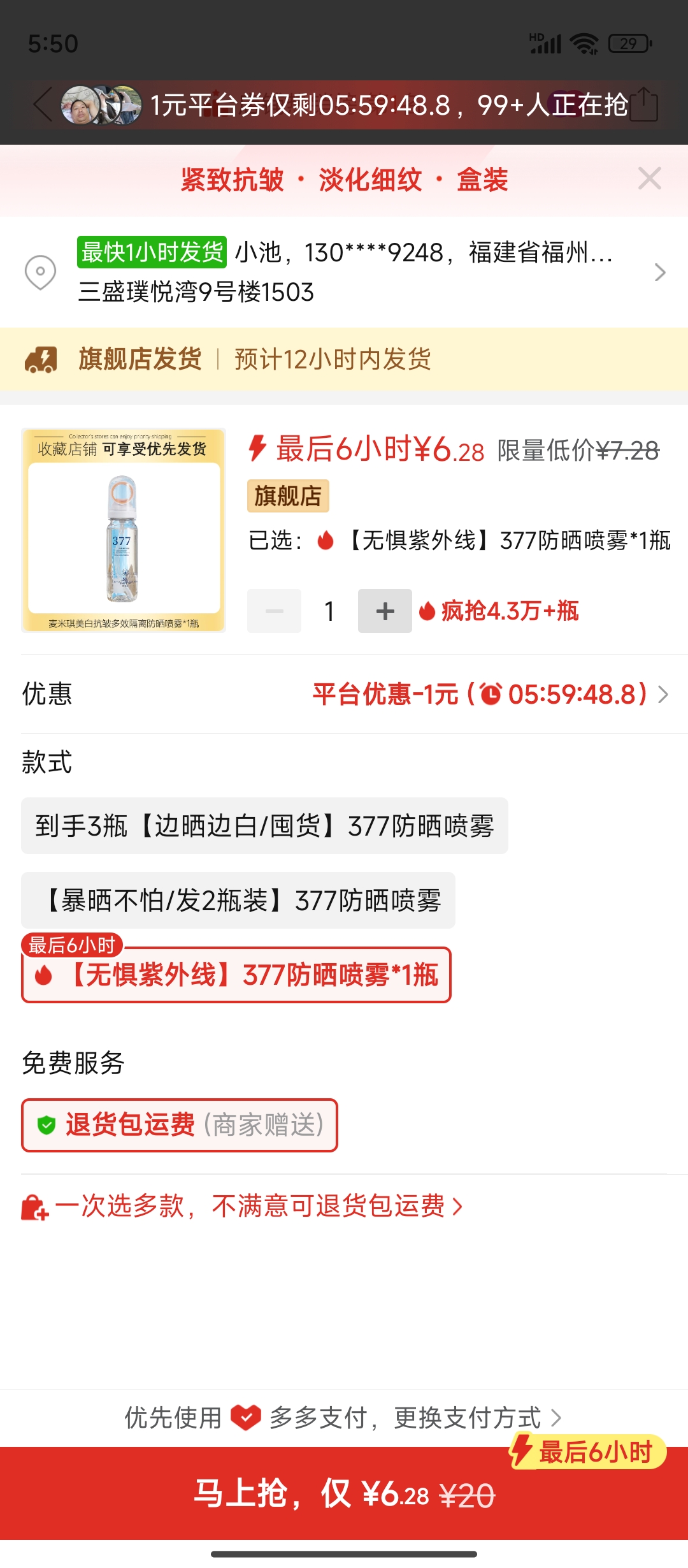 ⑦ 377防曬噴霧 1瓶 ⑧ 酵母洗面露 6瓶 ⑨ 床笠 珍珠灰 - 180*200cm 床笠款三件套【常規】1件 ⑩ 灰指甲液1瓶