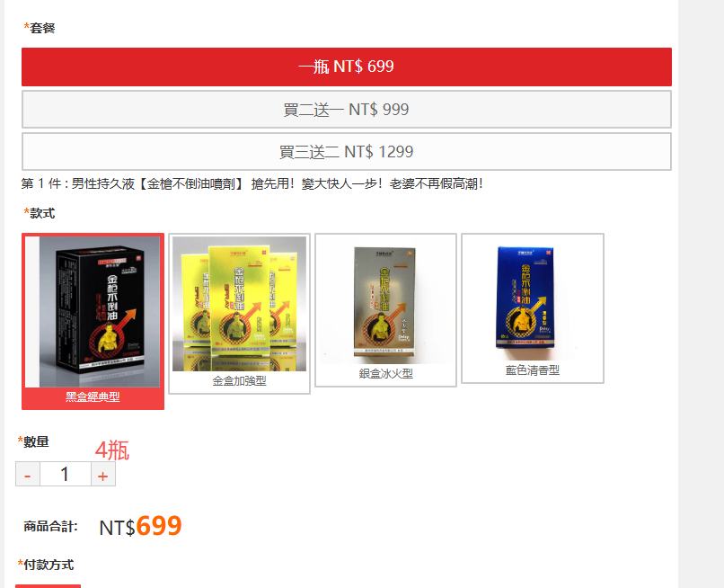 ①犀利仕100粒(金額:200)②金槍不倒油4瓶(金額:10)③非洲動力源3盒(金額:30)④售後補寄藍p,紫騎士,紅魔各一盒,黑馬10粒(金額:80)
