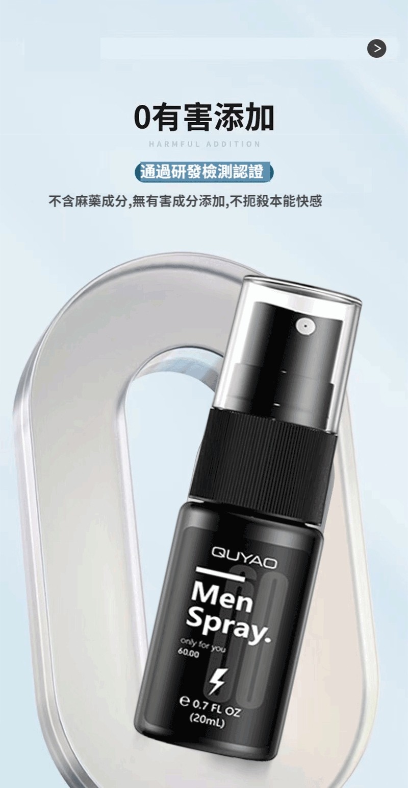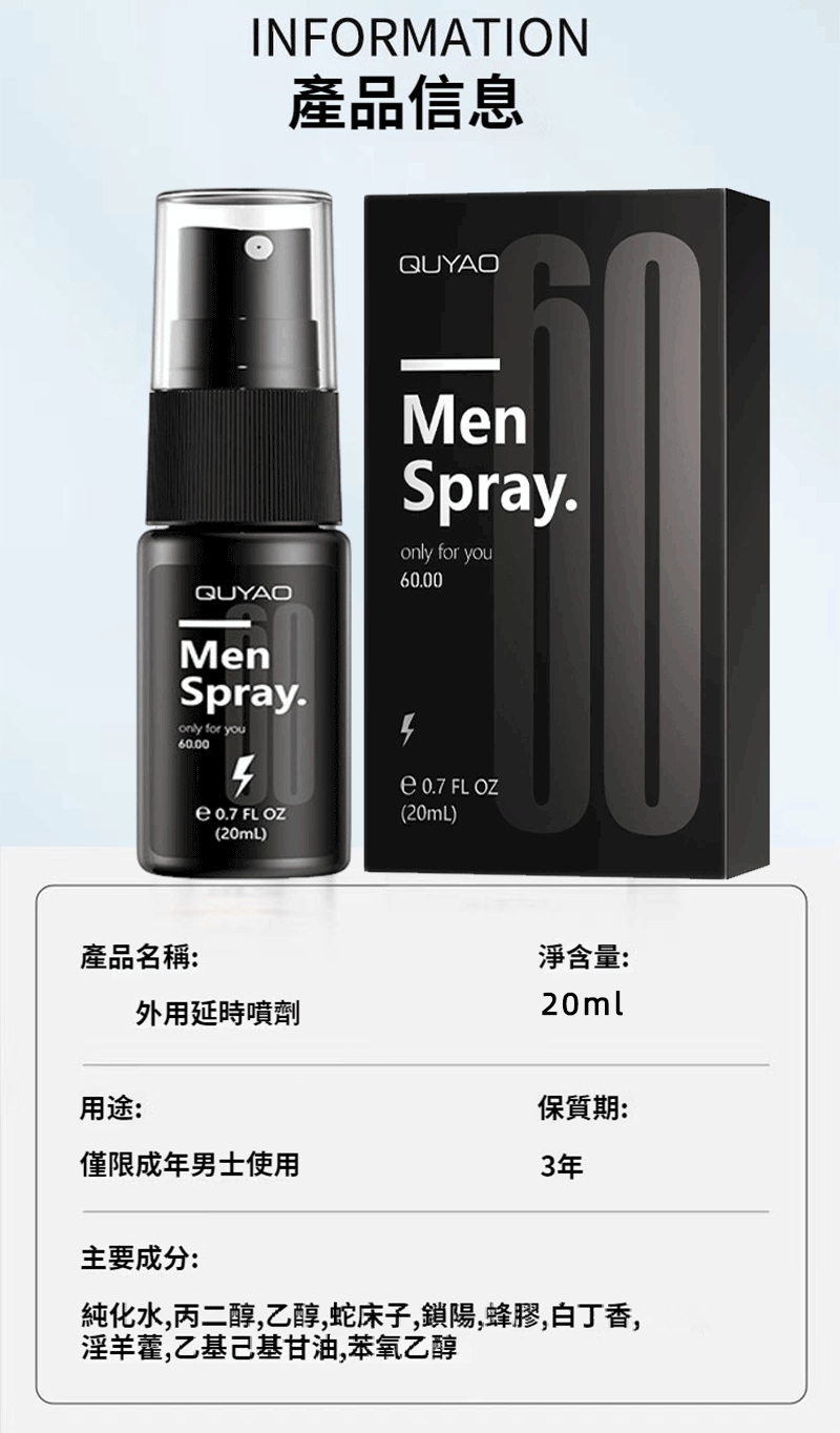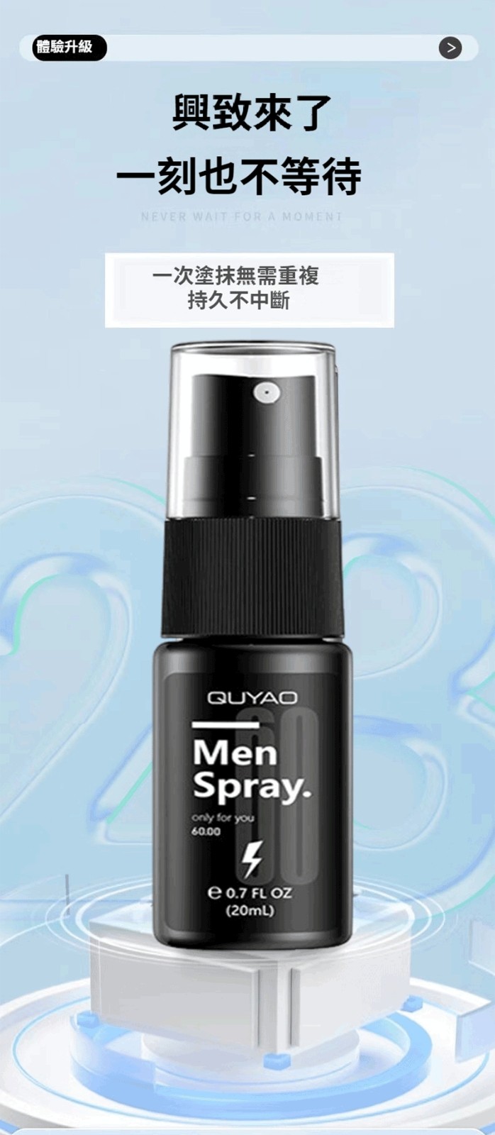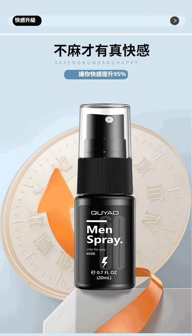 【QUYAO60男士延時噴劑・親密神隊友】 每次表現卡緊張?免煩惱!阮ㄟ「延時噴霧」給你自信滿滿~ ✔️ 溫和不刺激・效果看得見 ✔️ 植物萃取配方・降低敏感度・延長幸福感 ✔️ 清爽不黏膩・快速吸收・伴侶更滿意 ✔️ 隱密包裝・隱私百分百・訂購真安心 ??使用者見證: 「現在雙方攏盡興!感情變得更加甜蜜~」 NT$ 998