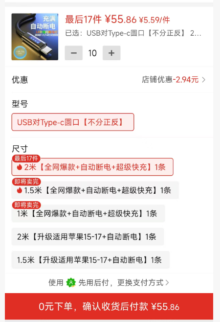 ①自动断电数据线10条(Type-C口,2米的)55.86元https://mobile.yangkeduo.com/goods.html?goods_id=900832240743&page_from=31&pxq_secret_key=7LK6TLQHWLIVT5CPBGI7R52UMI4HUBBCOCR3ITP6VQ4IKQIJK2PQ&_oak_share_snapshot_num=488&_oak_share_detail_id=21645651838&_oak_share_time=1772783445&share_oak_rcto=YWLJTsQpgNJKelZlMz4kK6zf_uSiXrLpeLijvvht9JFX6ADCWys5Lkw6&share_uin=CHIPUGRN2WN7IOY42AB45VG7BE_GEXDA&refer_share_id=12dc821769ad47e48f3f00254ce8994a&refer_share_uin=CHIPUGRN2WN7IOY42AB45VG7BE_GEXDA&refer_share_channel=copy_link&refer_share_form=text&uin=DNI7TGLJ2FTDPLYFXEZ2RMKMOE_GEXDA