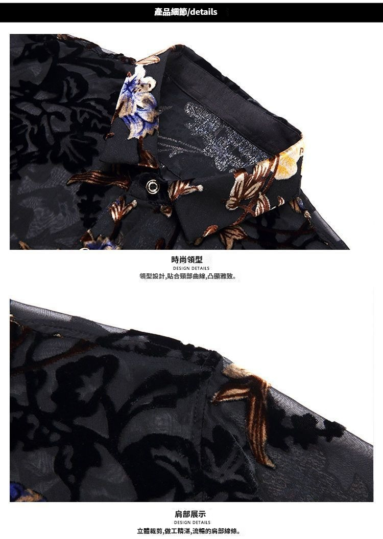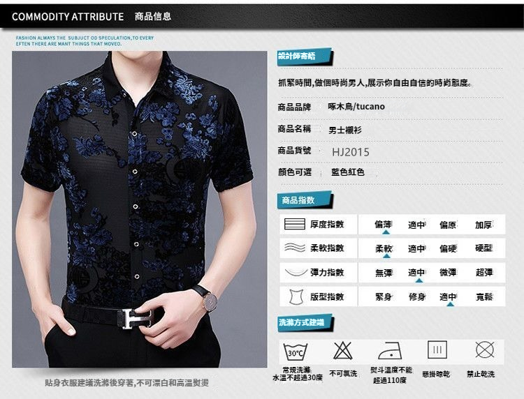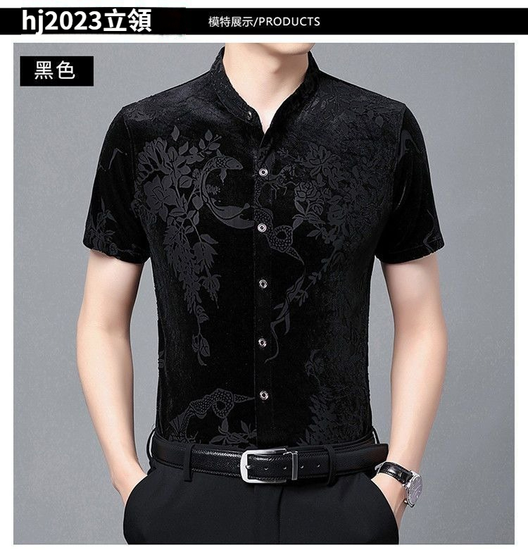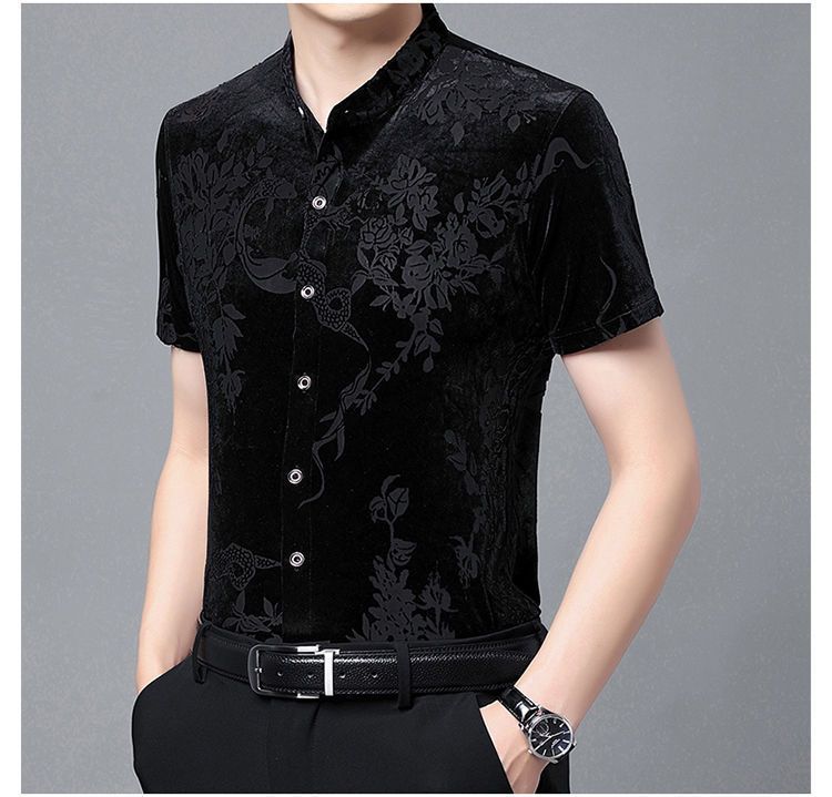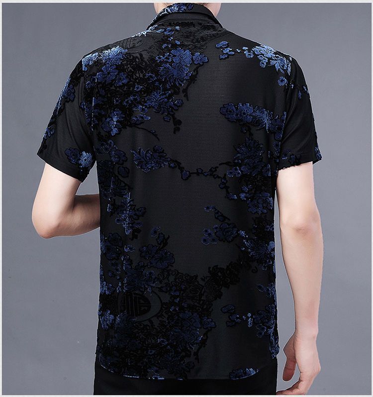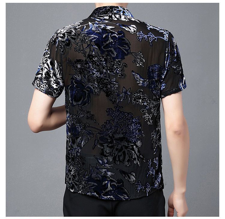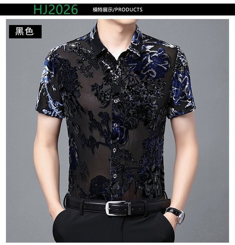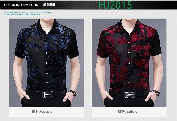第 2 件 : 高檔冰絲短袖男襯衫 夏季休閑修身潮流薄款襯衣植絨花襯衫