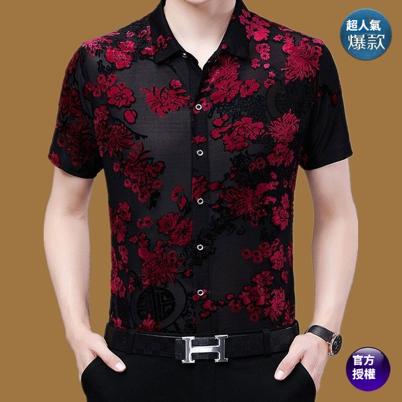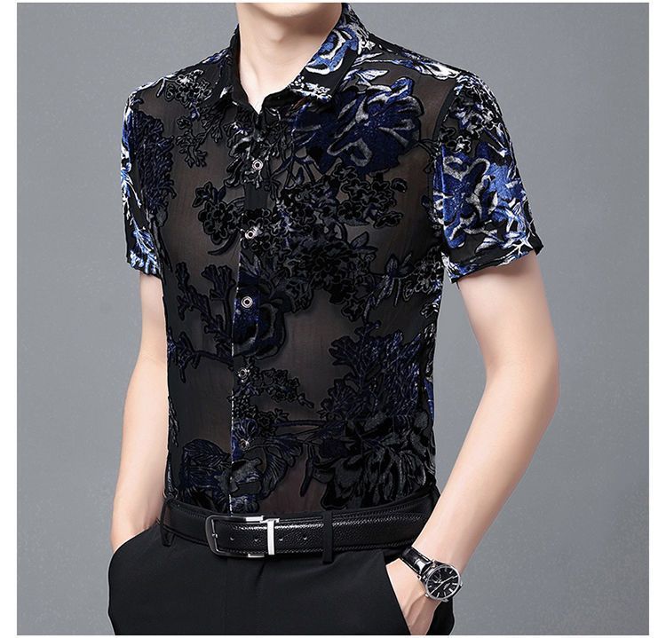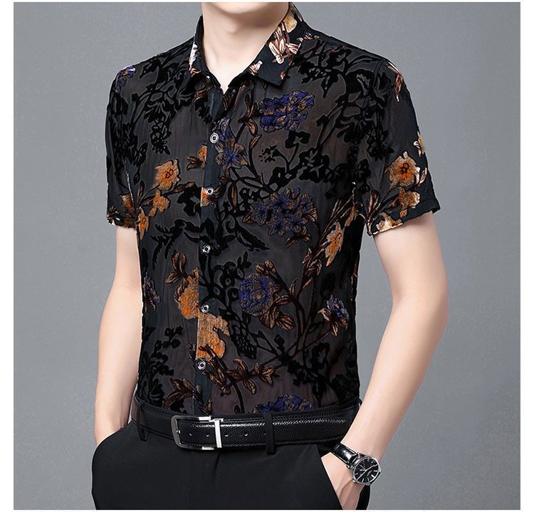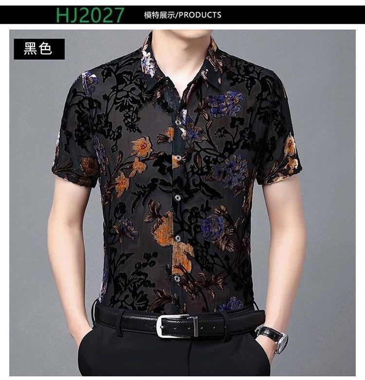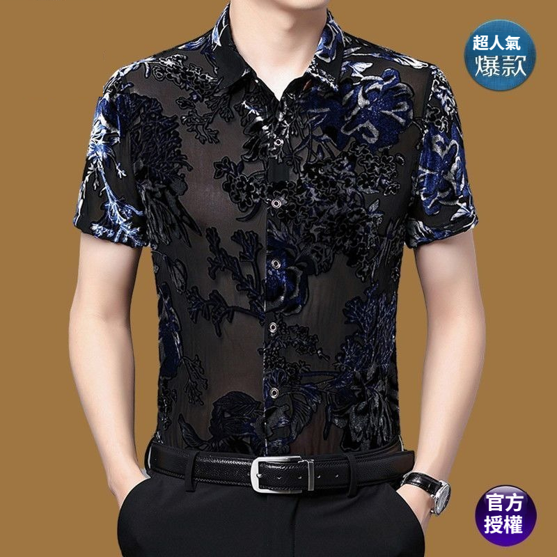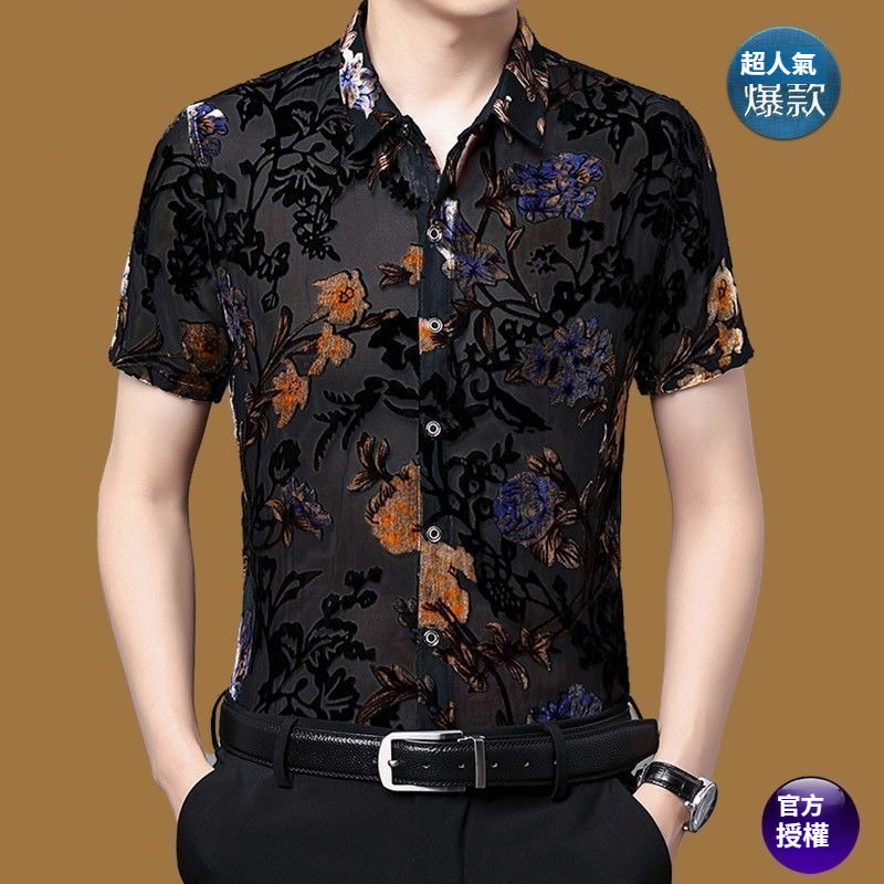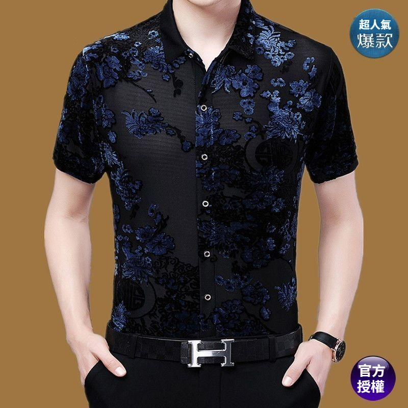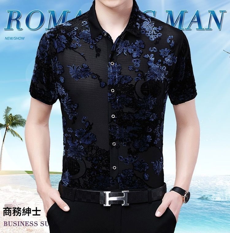 第 1 件 : 高檔冰絲短袖男襯衫 夏季休閑修身潮流薄款襯衣植絨花襯衫