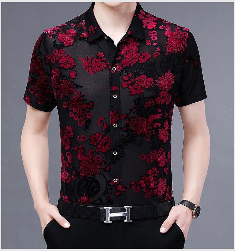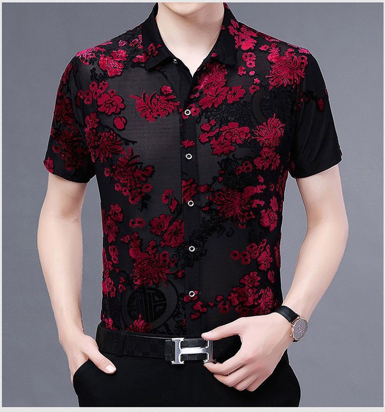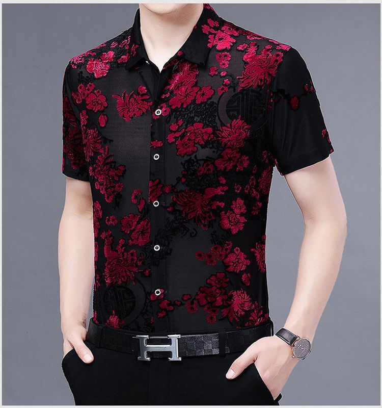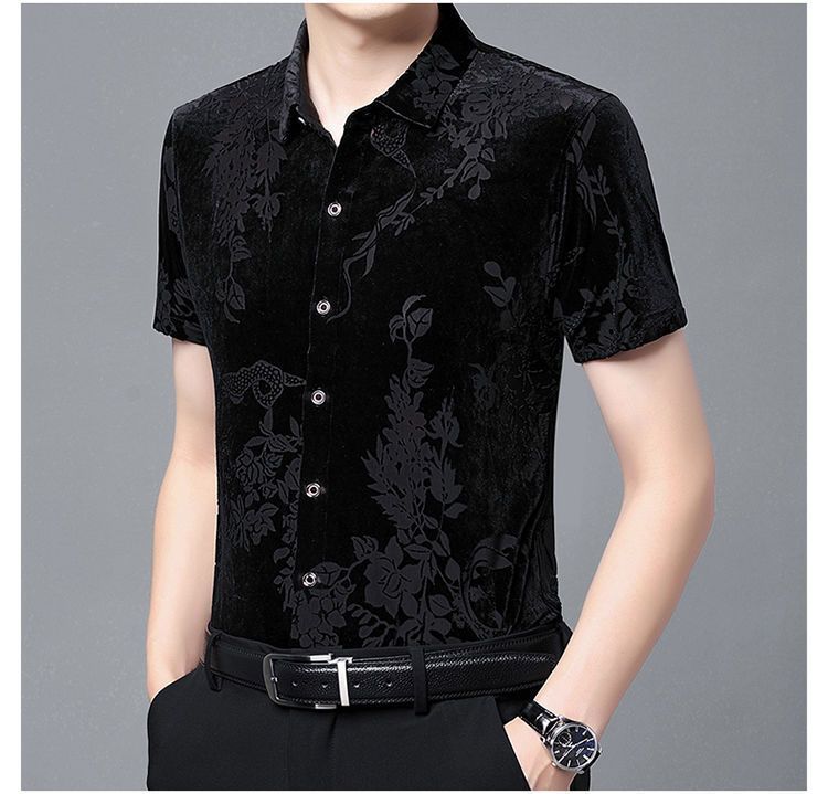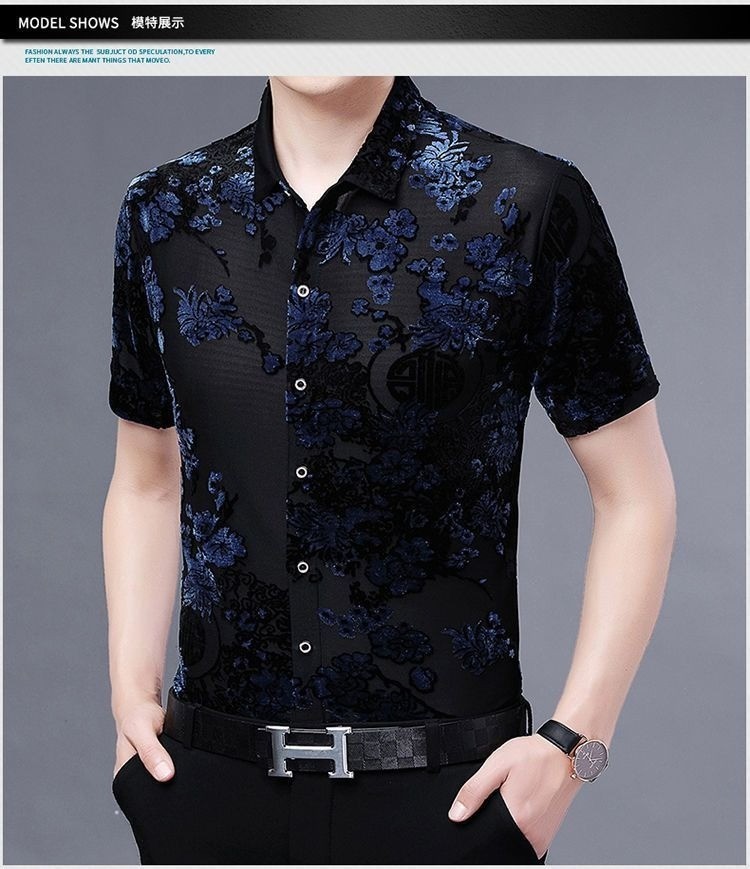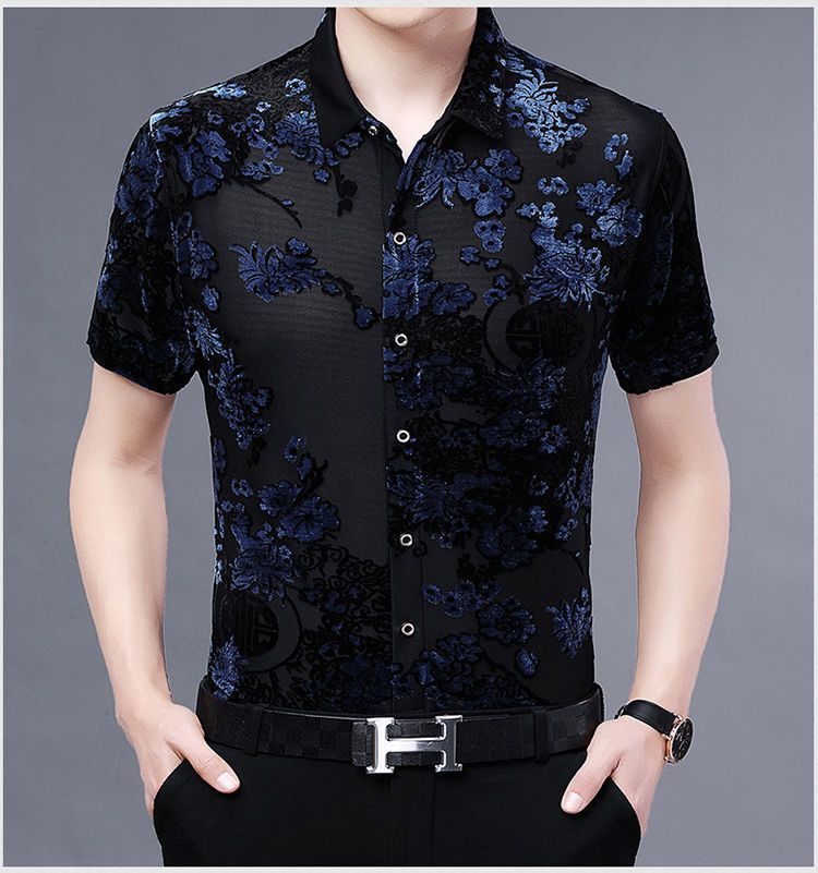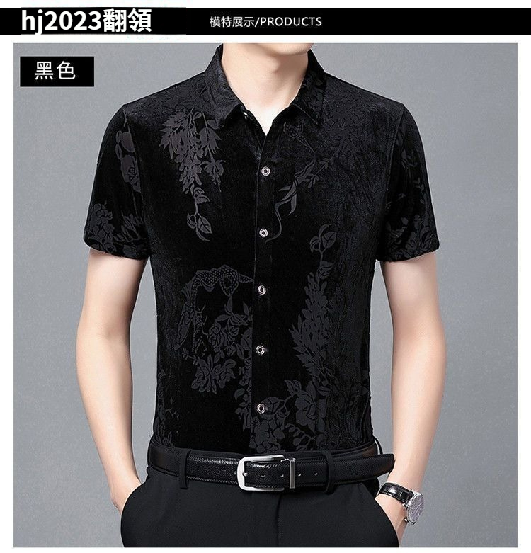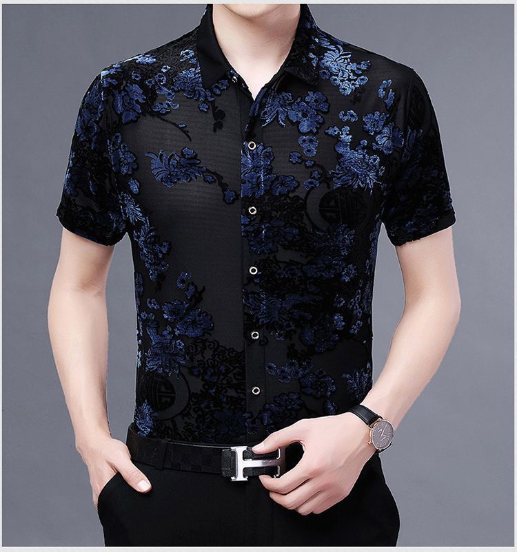 第 1 件 : 高檔冰絲短袖男襯衫 夏季休閑修身潮流薄款襯衣植絨花襯衫