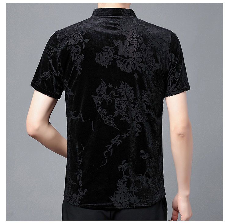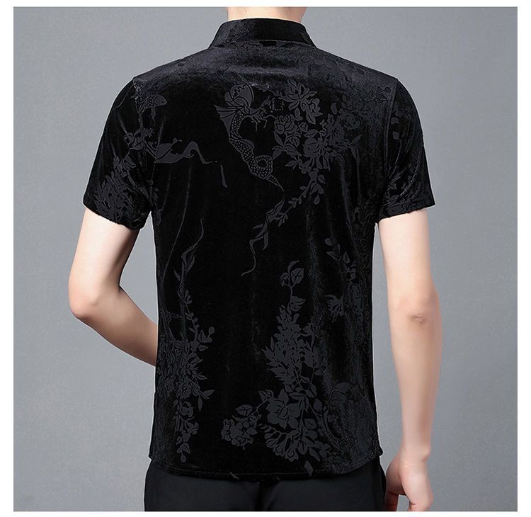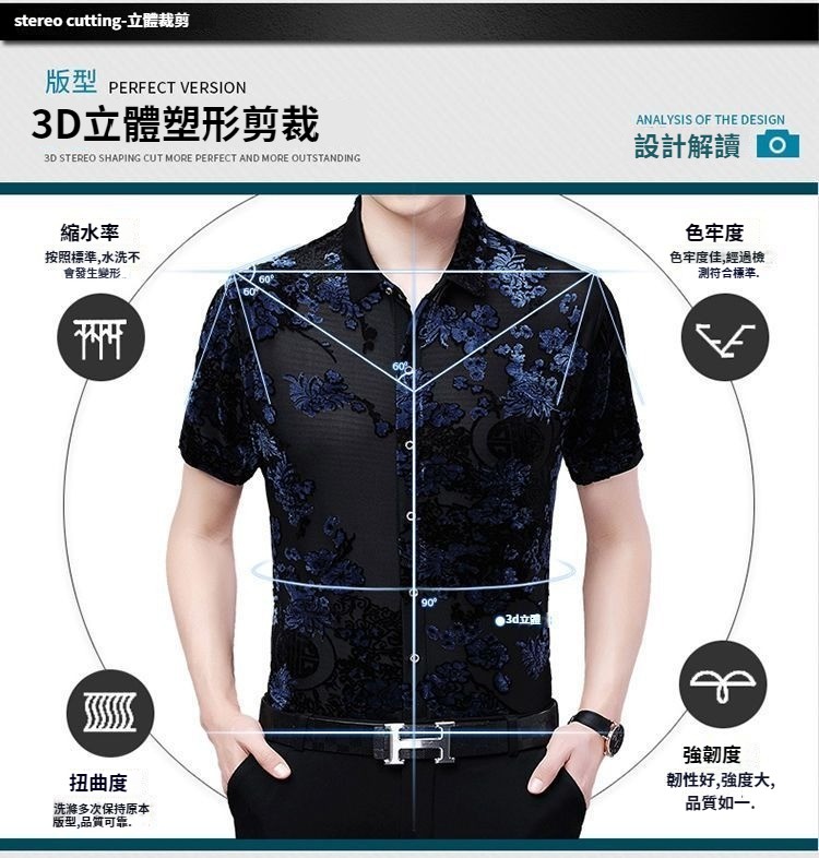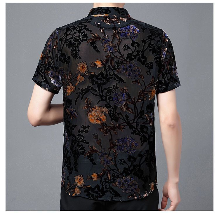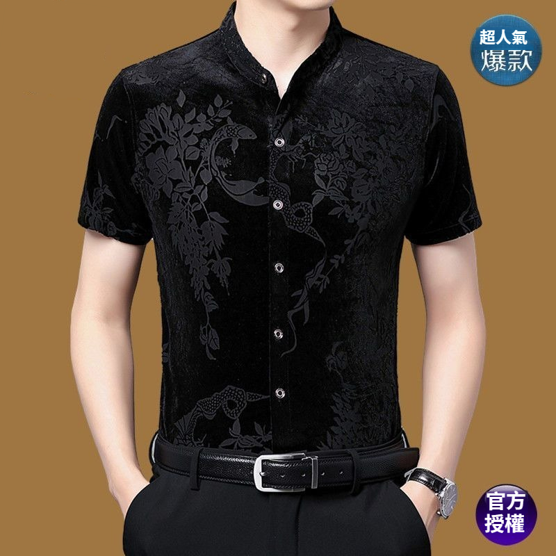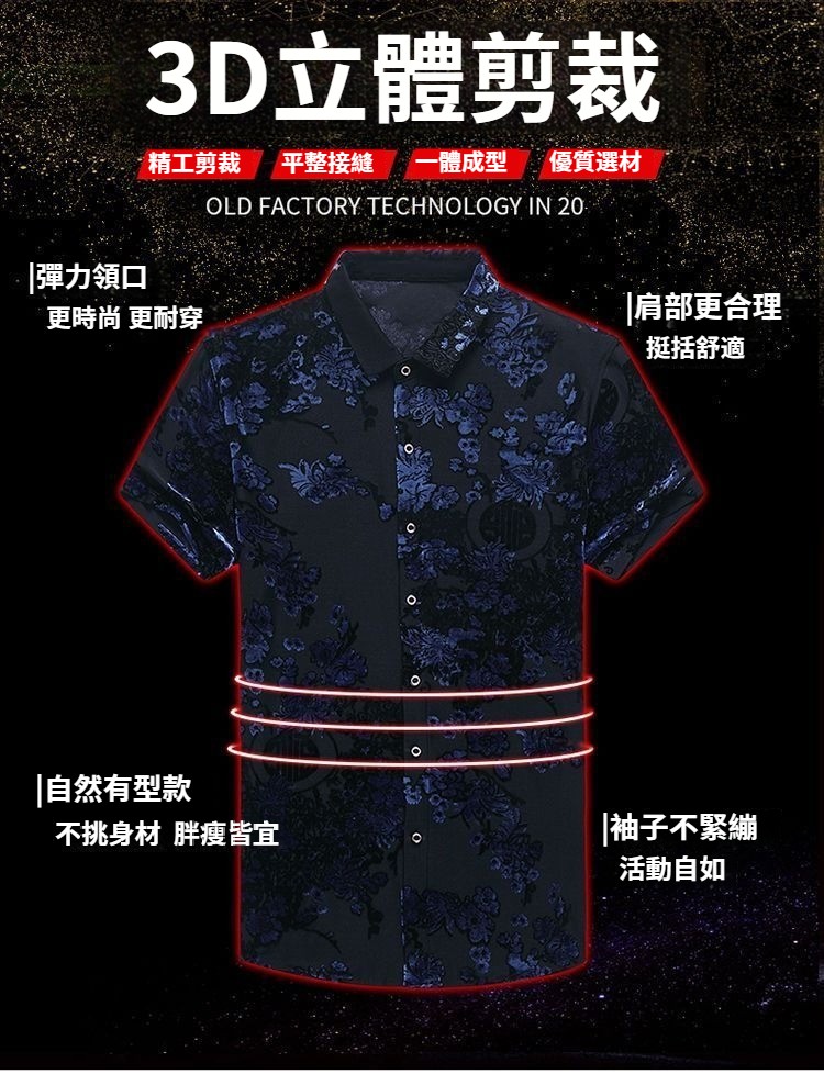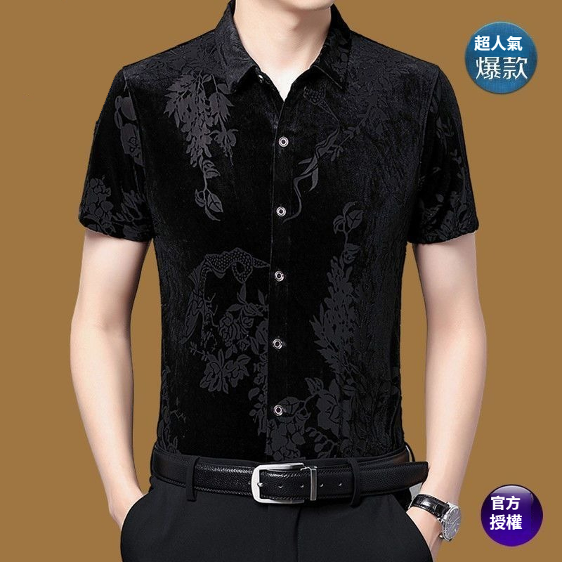 高檔冰絲短袖男襯衫 夏季休閑修身潮流薄款襯衣植絨花襯衫