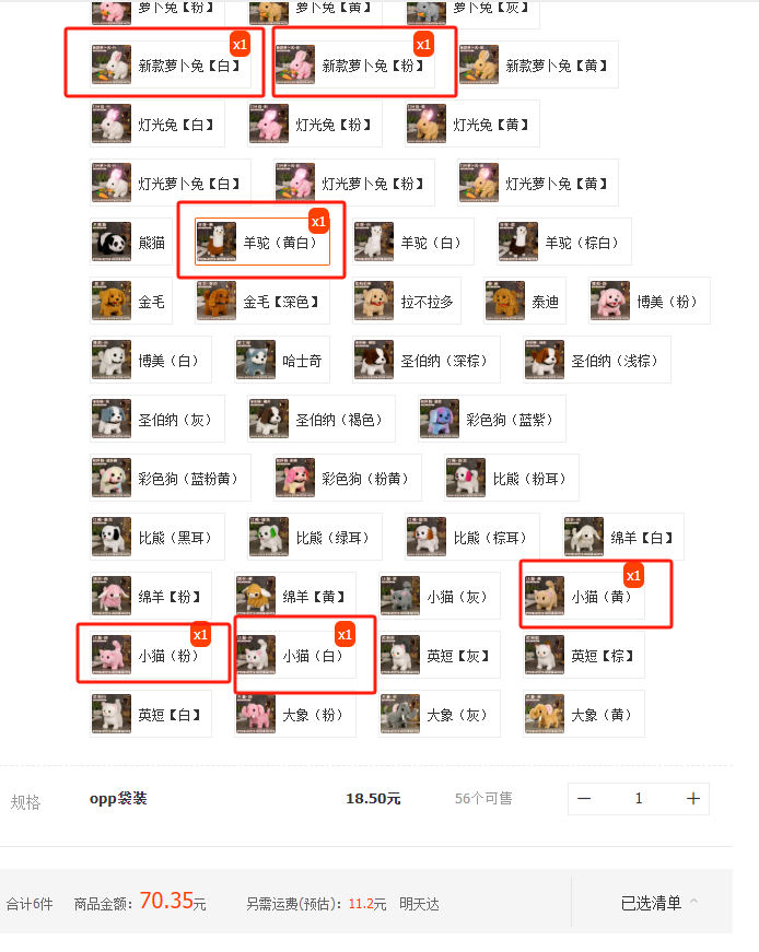 ①绒电动玩具 6個(新款萝卜兔-白*1、新款萝卜兔-粉*1、小猫-粉*1、小猫-黄*1、小猫-白*1、羊驼-黄白*1)