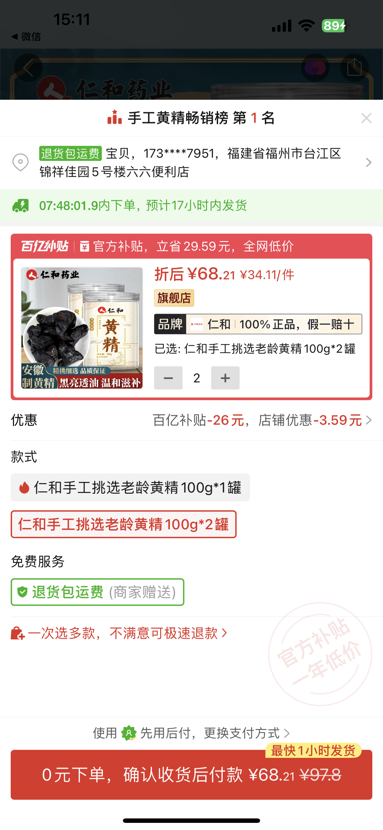 ①仁和黃精100g罐裝4罐+②印度黑馬1粒