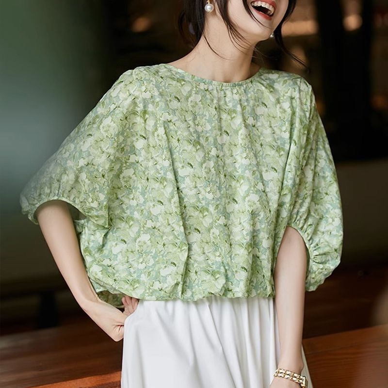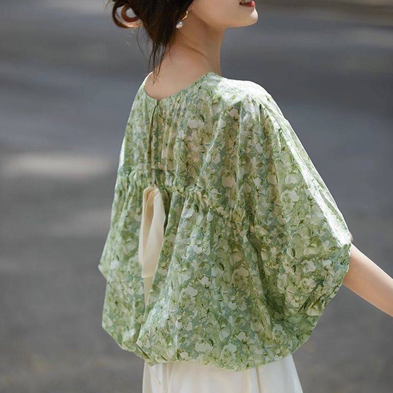 雪紡衫短袖蝙蝠袖女,夏季新款氣質寬鬆垂感冰冷感防曬寬鬆襯衫上衣