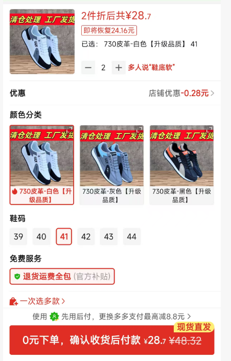 ①阿甘男鞋(白色2双41碼)28.9元