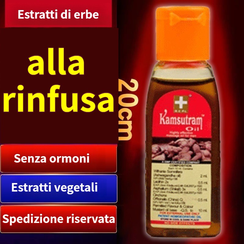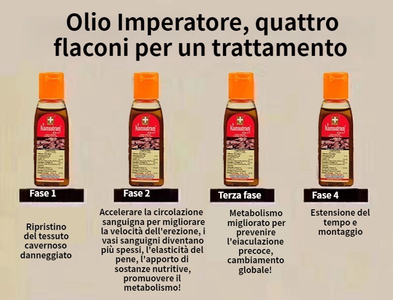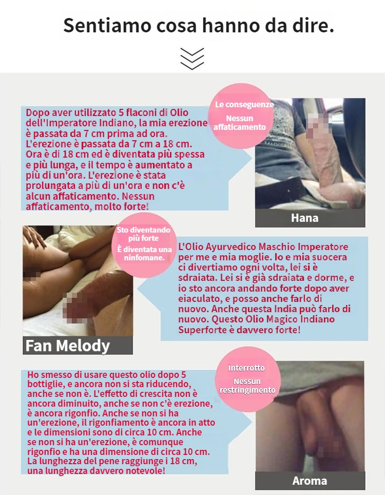 (Finché un giorno ho visto su Internet che il nostro olio indiano (Ayurvedic Men's Emperor Oil) era stato presentato come un estratto vegetale puro al 100%, non solo privo di effetti collaterali, ma anche garantito al 100% per curare l'impotenza e l'eiaculazione precoce, e può anche ingrandire il pene di 7-15 cm e ispessirlo di 3-8 cm, può durare più di 40 minuti durante il rapporto e può provocare un'erezione con una leggera stimolazione. Quindi ho pensato che almeno assumerlo non avrebbe danneggiato gli organi interni e non avrebbe creato dipendenza. Ho deciso subito di farlo provare a mio marito!)