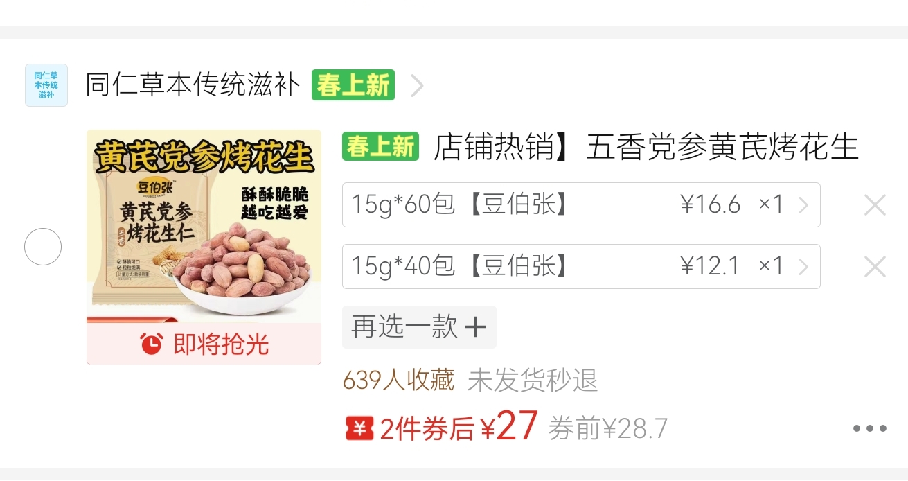 ①手工駝奶疙瘩(三斤三袋)共1件 67.86元 https://mobile.yangkeduo.com/goods1.html?ps=6LK6XvIGse ②黃芪黨參烤花生(60包+40包)共100包 28.7元 https://mobile.yangkeduo.com/goods.html?ps=hVphdI6N9A