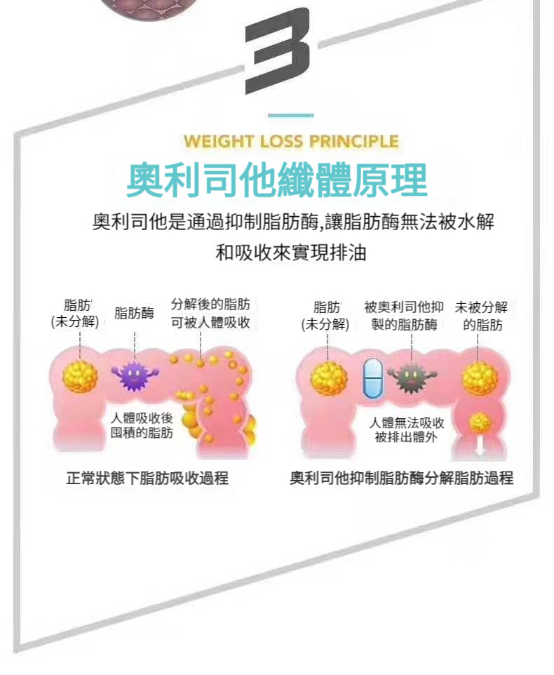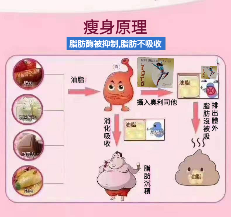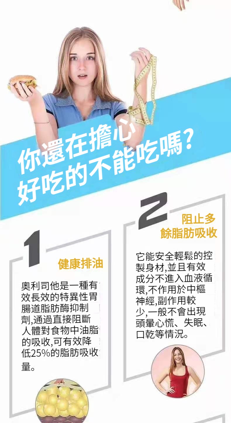 奧利司他成分,可以快速吸附腸道內的油脂,阻斷腸胃吸收,防止脂肪堆積,從根源上斷絕發胖的可能性