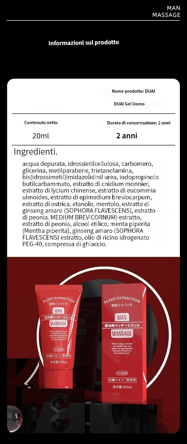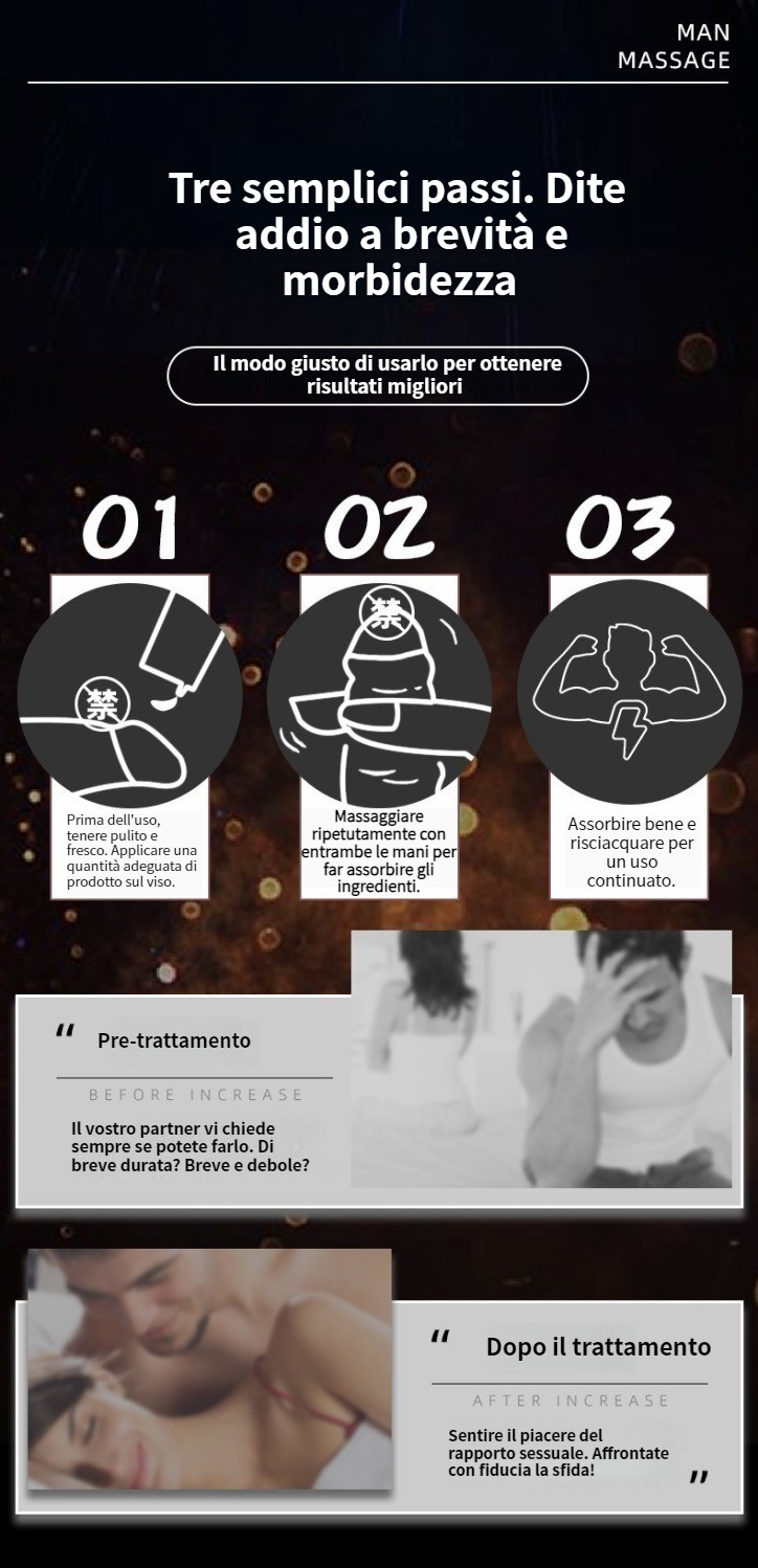 Dopo il lancio di [Men's Gel], il team di ricerca e sviluppo ha annunciato tutte le materie prime vegetali utilizzate, ma il rapporto e la formula sono stati mantenuti strettamente riservati. Il team di ricerca può generare un fatturato annuo di 130 miliardi di dollari con la formula di questo prodotto!