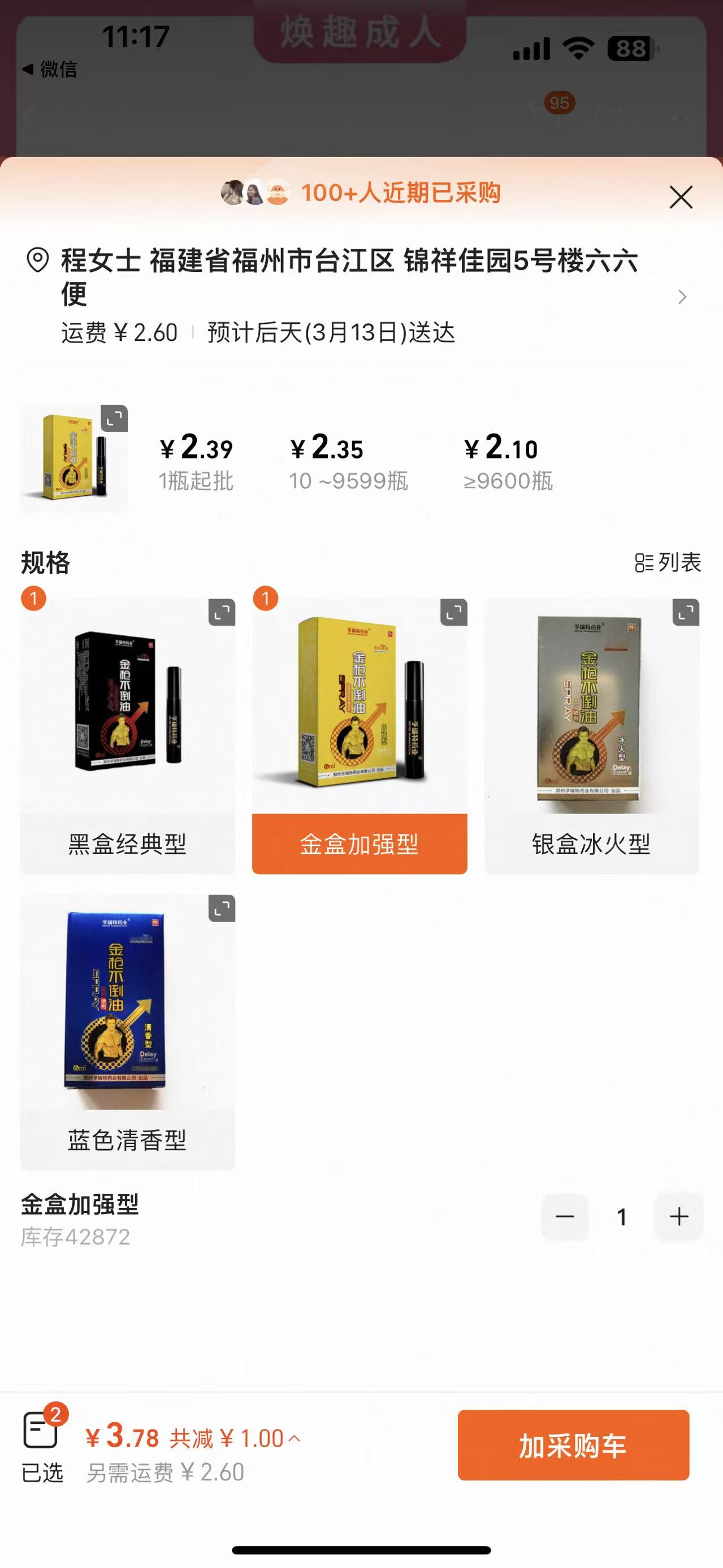 ①藍蝌蚪雙效片30粒②金槍不倒油2瓶 黑盒1瓶 金色盒子1瓶(66.38元)