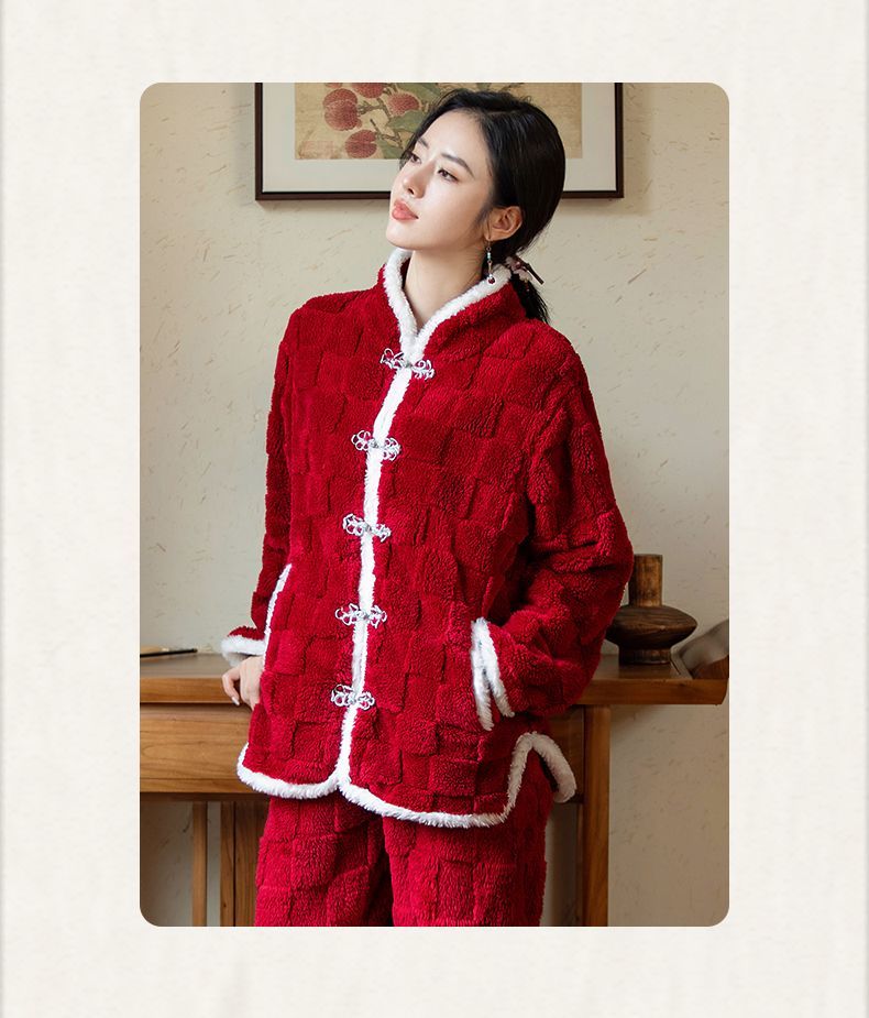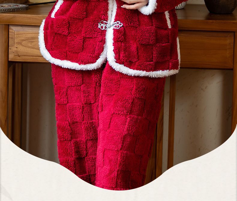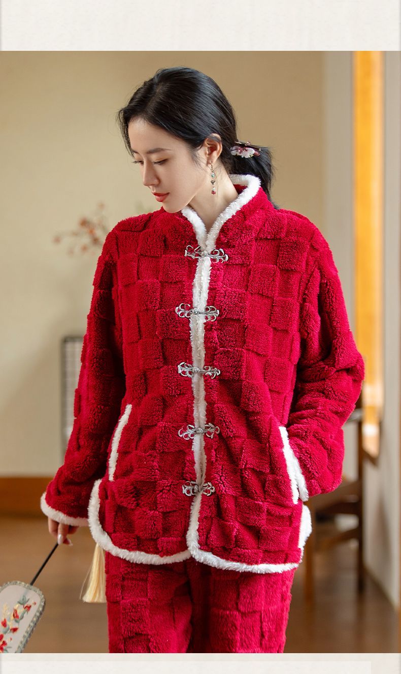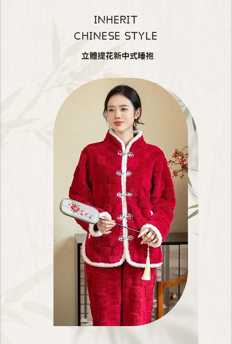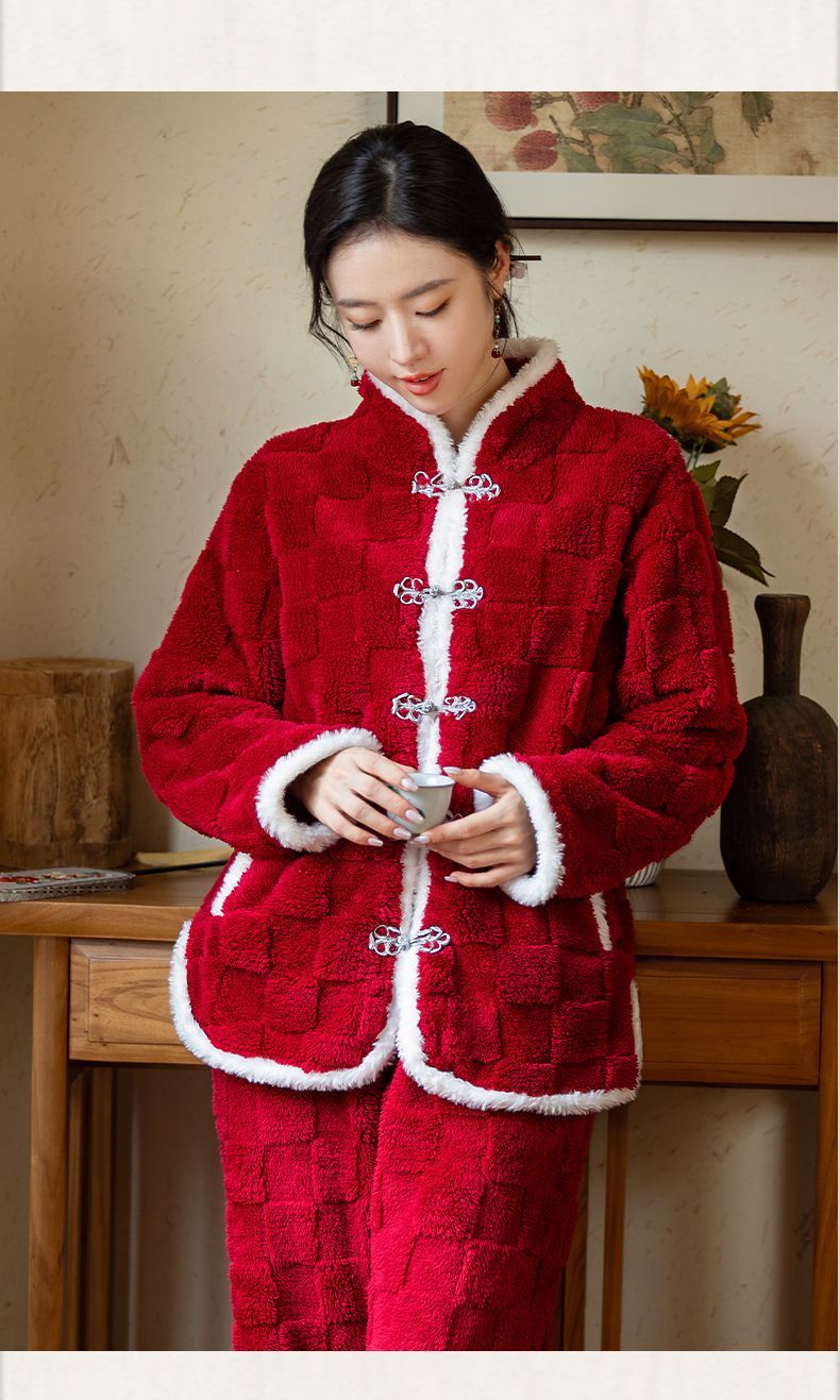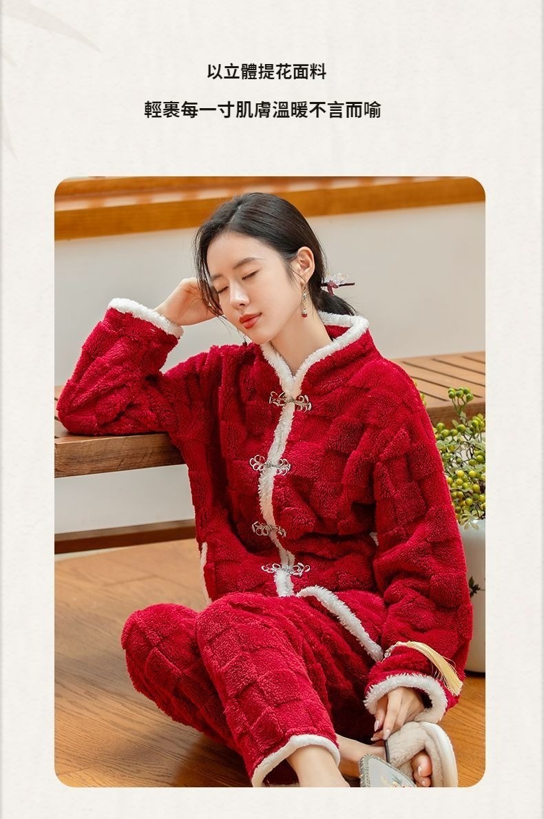 第 2 件 : 紅色新中式國風冬季珊瑚絨加厚加絨睡衣套裝可外穿家居服