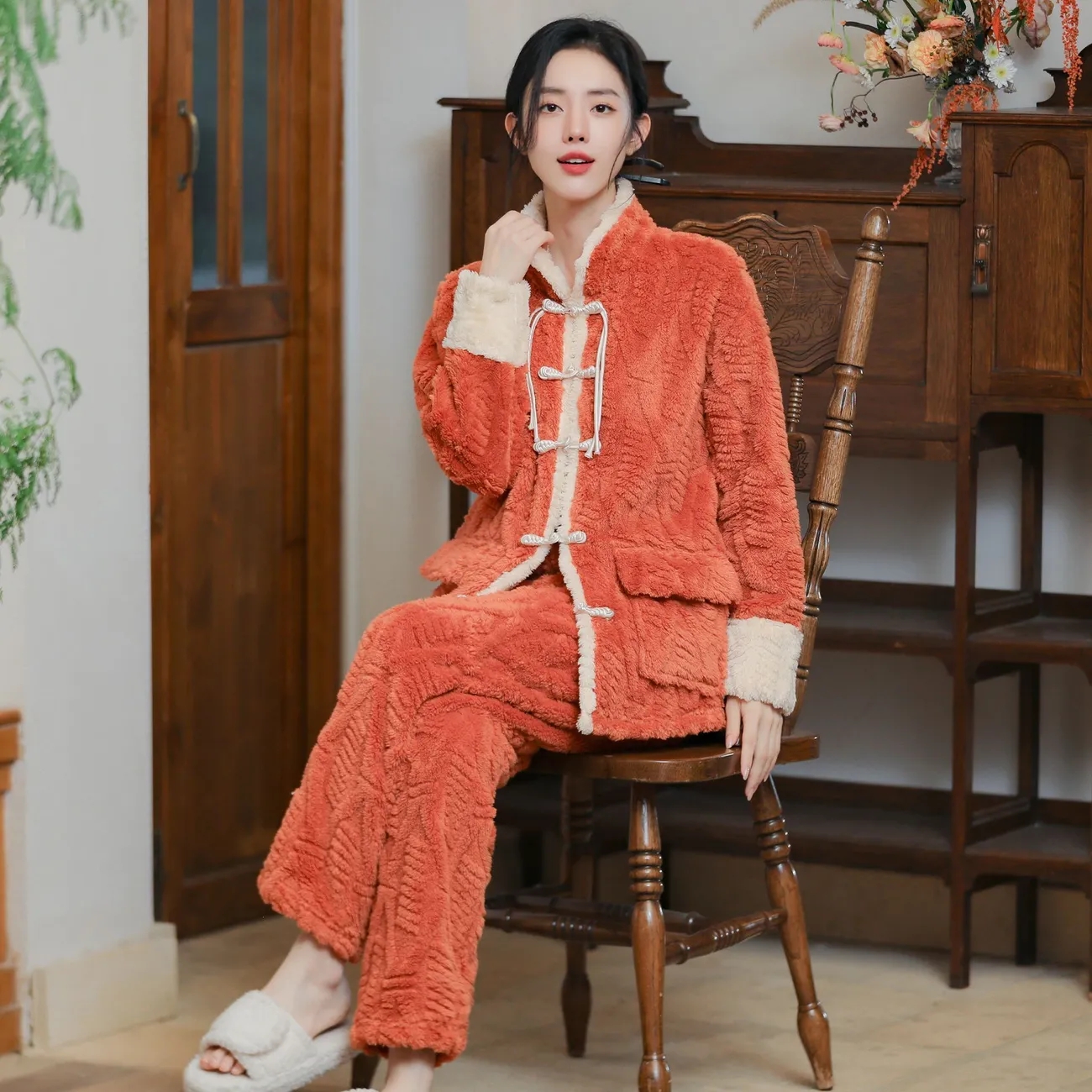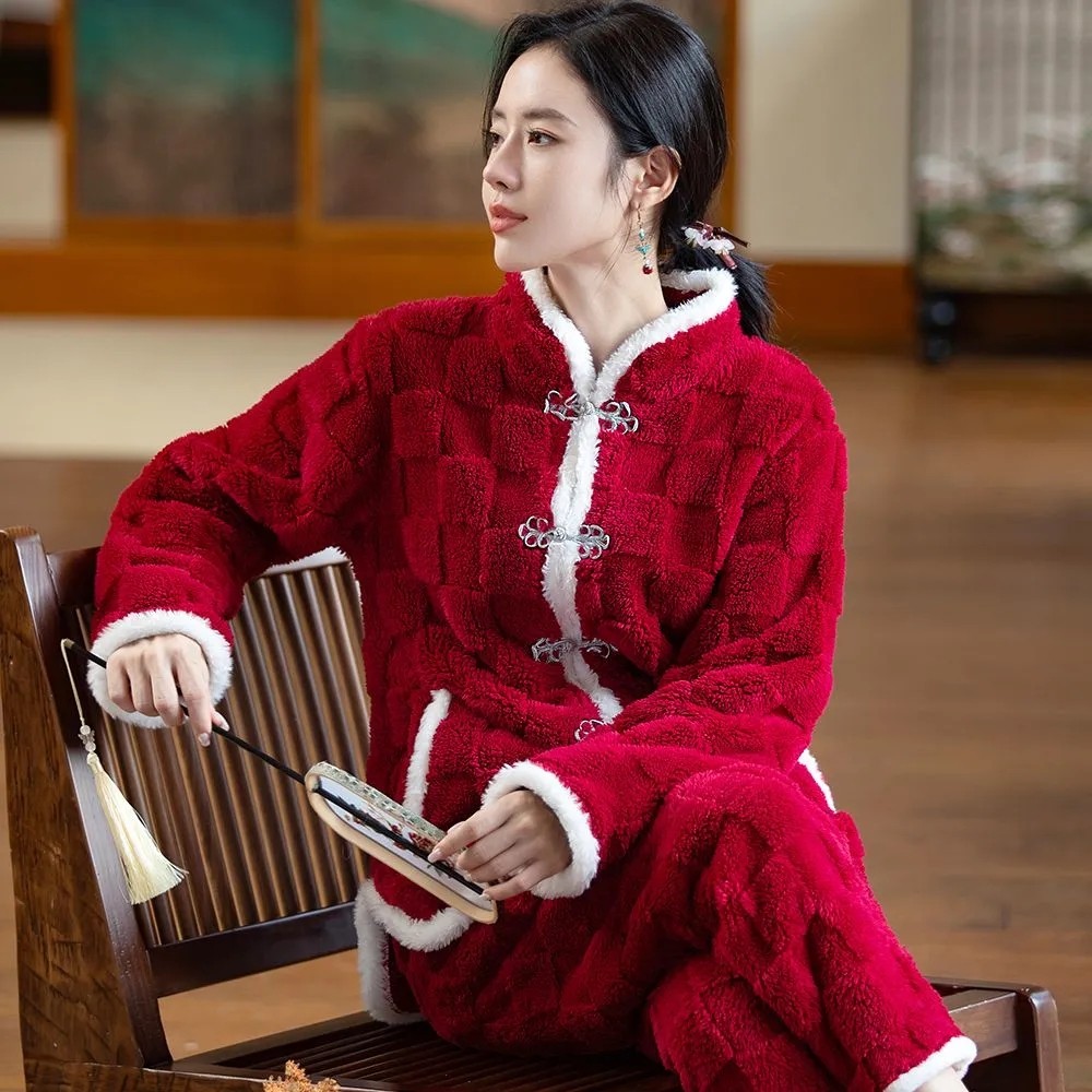 紅色新中式國風冬季珊瑚絨加厚加絨睡衣套裝可外穿家居服