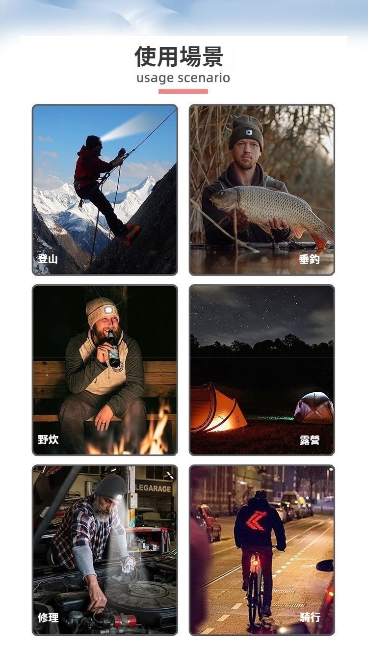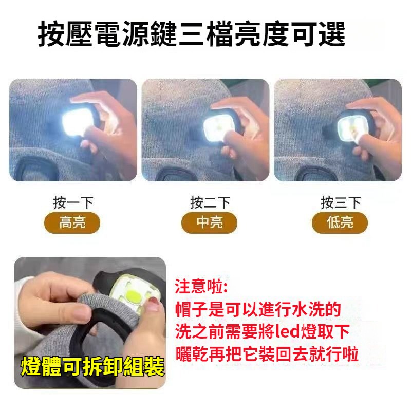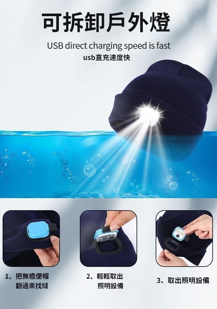 第 4 件 : 【冬日發光體 | 可拆式LED頭燈針織帽】 一頭溫暖,一頭照亮,讓每個夜晚的腳步踏實生光。 ▸ 加厚針織帽身鎖住溫度,緊貼頭型不勒不鬆。 ▸ 帽簷內建可拆式LED燈條,三檔調光 ▸ 燈條獨立充電,USB接口,取下可作手電筒、帳篷燈。 照亮你那些需要光的時刻 · 夜跑/遛狗時,解放雙手,眼前一路明亮 · 清晨趕班/騎行,在昏暗街頭做自己的燈塔 · 露營、戶外檢修,燈光隨頭轉動,指哪照哪 · 深夜歸家,鑰匙找鎖孔不再摸黑 願你的冬天,既暖,又亮。