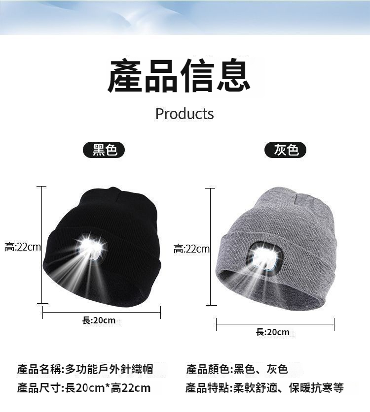 第 1 件 : 【冬日發光體 | 可拆式LED頭燈針織帽】 一頭溫暖,一頭照亮,讓每個夜晚的腳步踏實生光。 ▸ 加厚針織帽身鎖住溫度,緊貼頭型不勒不鬆。 ▸ 帽簷內建可拆式LED燈條,三檔調光 ▸ 燈條獨立充電,USB接口,取下可作手電筒、帳篷燈。 照亮你那些需要光的時刻 · 夜跑/遛狗時,解放雙手,眼前一路明亮 · 清晨趕班/騎行,在昏暗街頭做自己的燈塔 · 露營、戶外檢修,燈光隨頭轉動,指哪照哪 · 深夜歸家,鑰匙找鎖孔不再摸黑 願你的冬天,既暖,又亮。