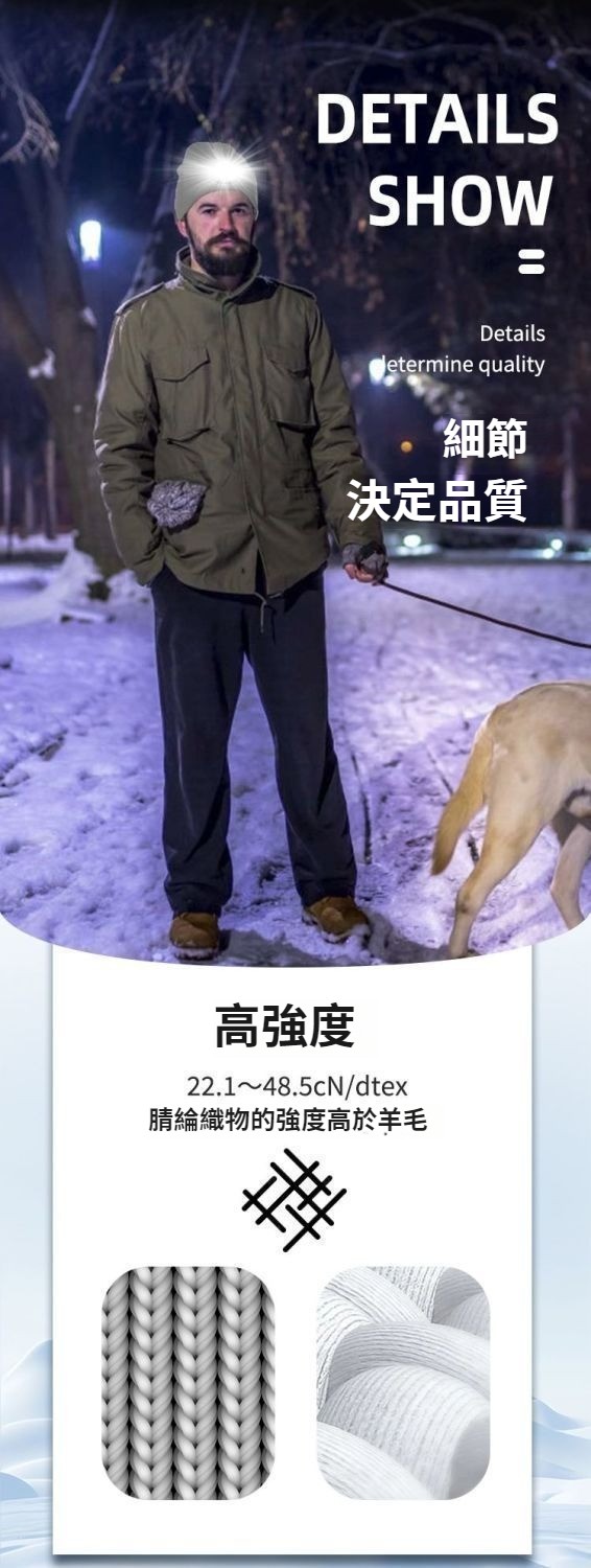 第 6 件 : 【冬日發光體 | 可拆式LED頭燈針織帽】 一頭溫暖,一頭照亮,讓每個夜晚的腳步踏實生光。 ▸ 加厚針織帽身鎖住溫度,緊貼頭型不勒不鬆。 ▸ 帽簷內建可拆式LED燈條,三檔調光 ▸ 燈條獨立充電,USB接口,取下可作手電筒、帳篷燈。 照亮你那些需要光的時刻 · 夜跑/遛狗時,解放雙手,眼前一路明亮 · 清晨趕班/騎行,在昏暗街頭做自己的燈塔 · 露營、戶外檢修,燈光隨頭轉動,指哪照哪 · 深夜歸家,鑰匙找鎖孔不再摸黑 願你的冬天,既暖,又亮。
