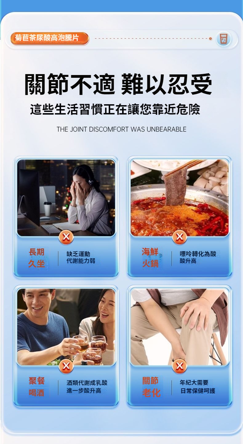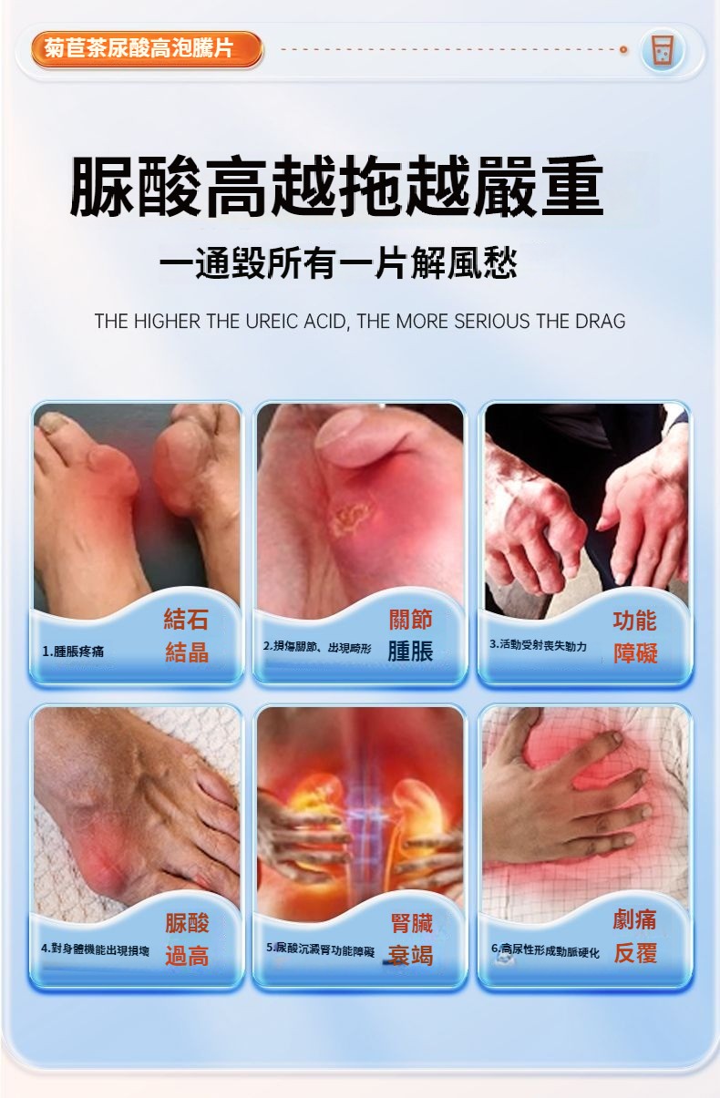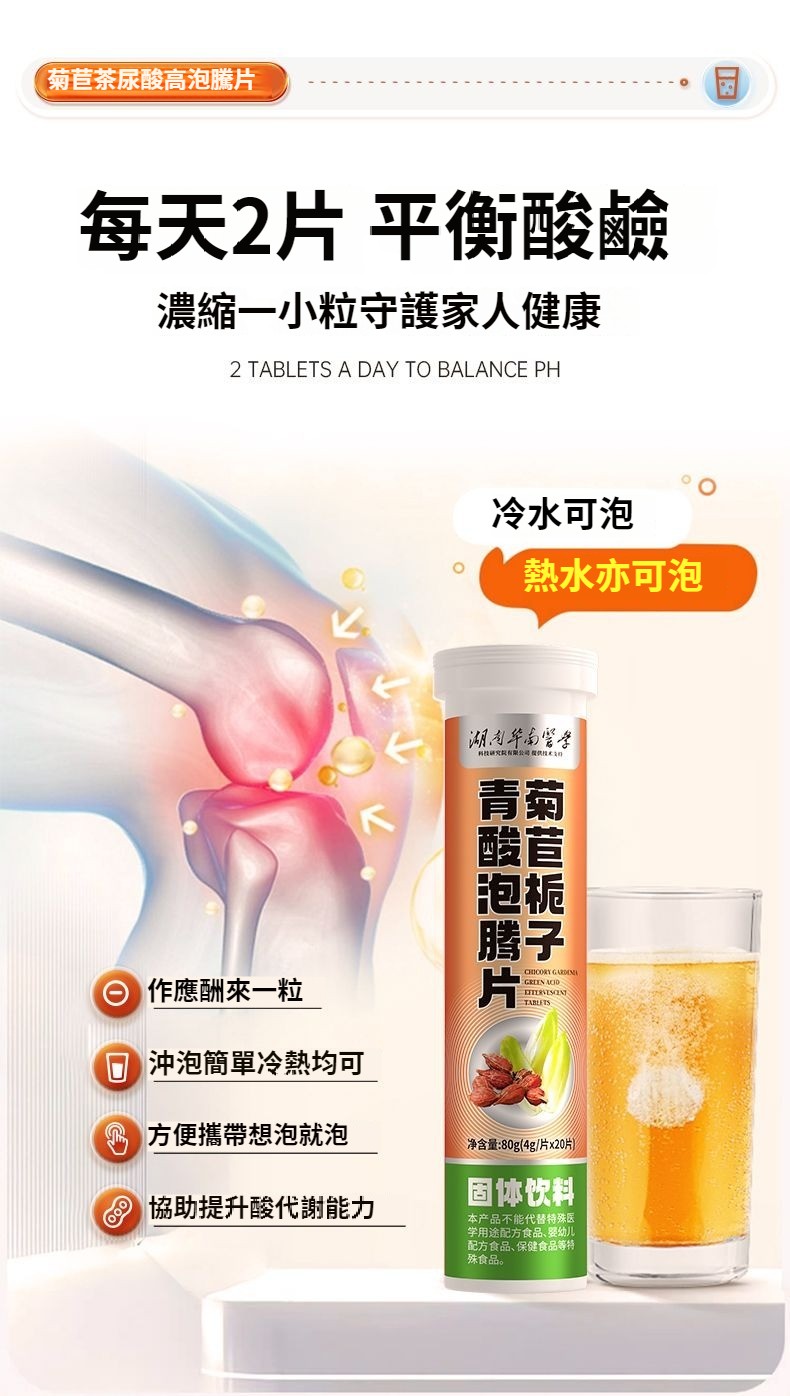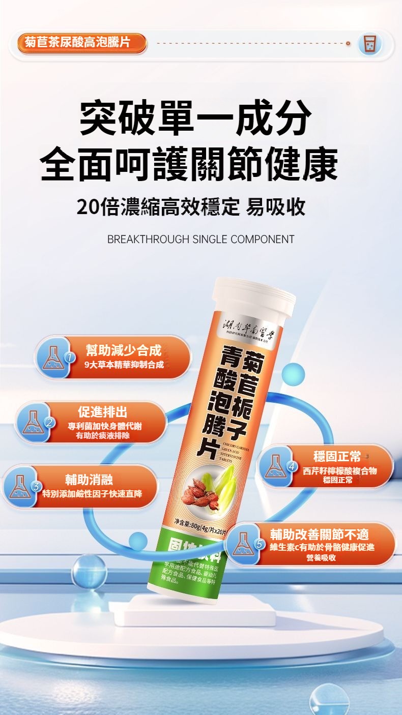 【20倍濃縮菊苣梔子泡騰片】是清嘌不是降嘌 脲酸高越拖越嚴重, 1.結石結晶、腫脹疼痛;2.損傷關節,出現畸形;3.活動受限,功能障礙;4.脲酸過高損壞身體機能;5.尿酸沉淀導致腎臟功能異常;6.動脈硬化疼痛反復;添加維生素C 一通毀所有 ,一片解風愁!找回元氣自信的你,促進營養吸收,促進骨骼生長,提高免疫力。一泡即溶 更好吸收。 NT$ 1280