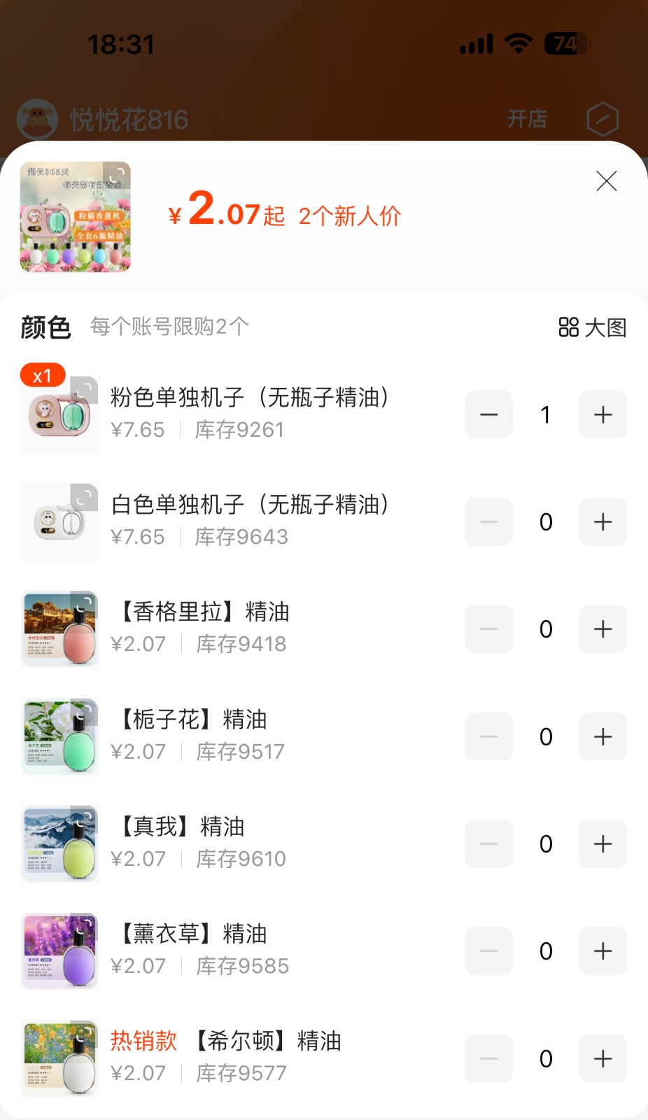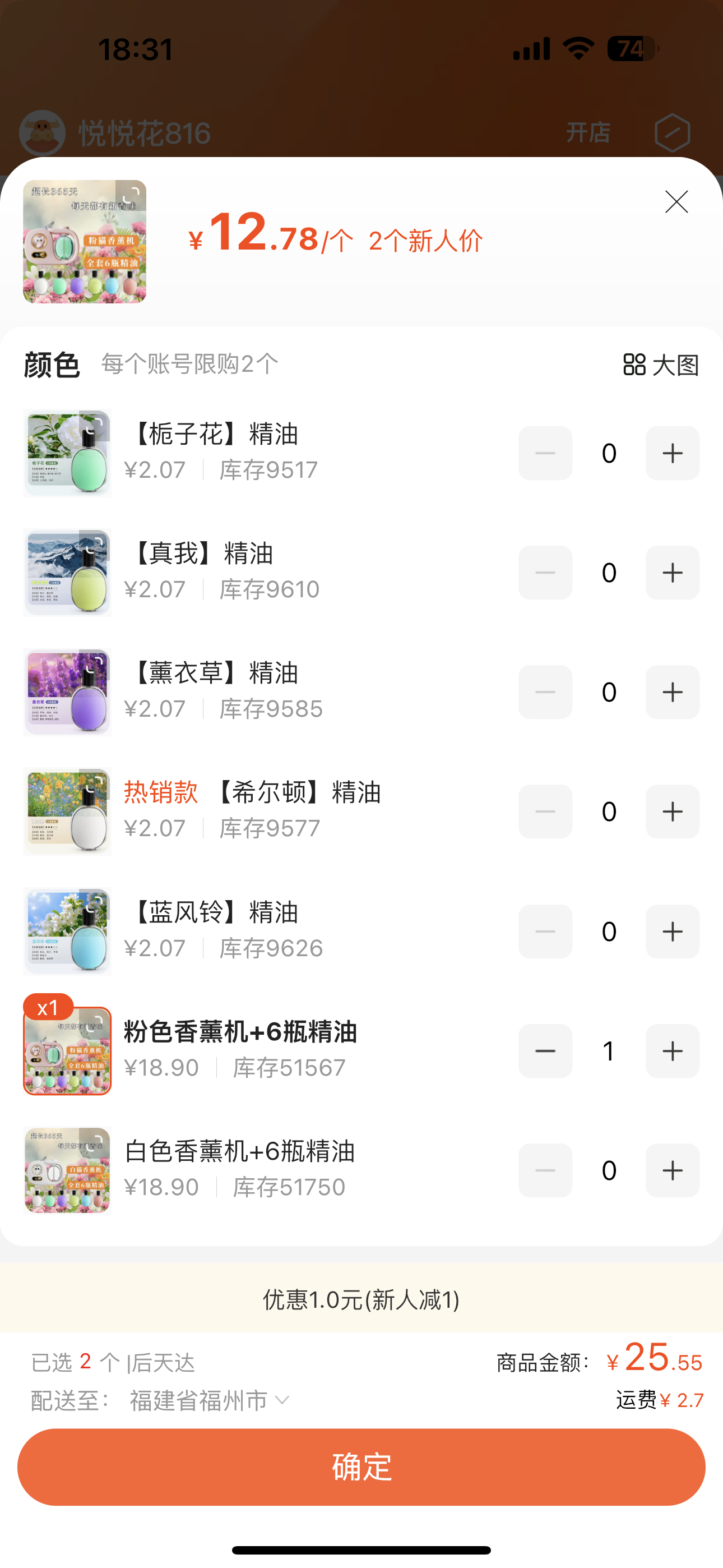 ①粉色香薰機2臺 ②6瓶精油