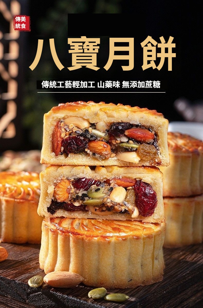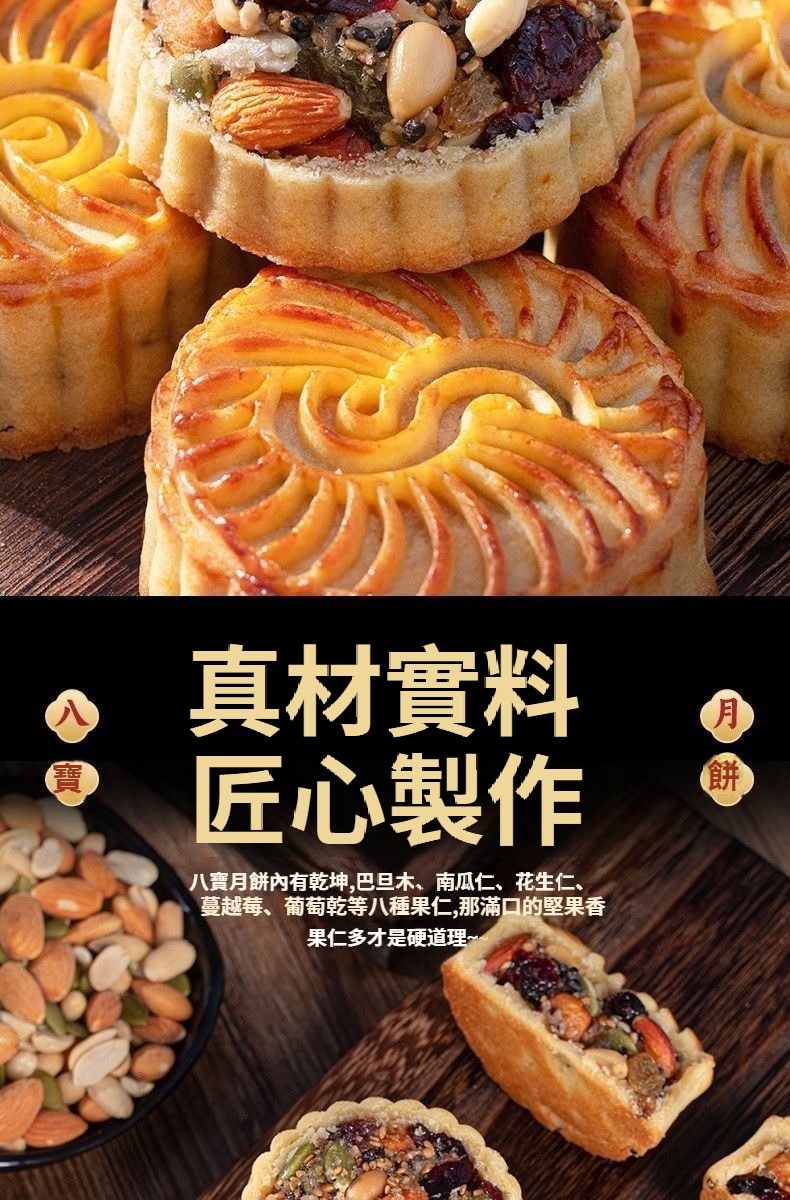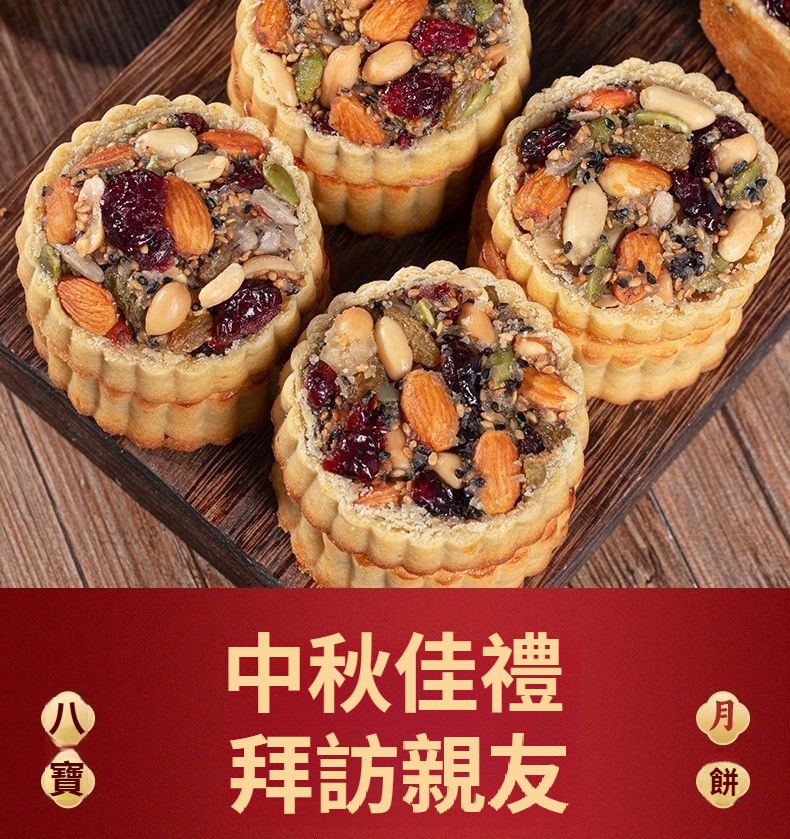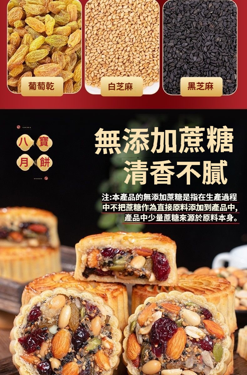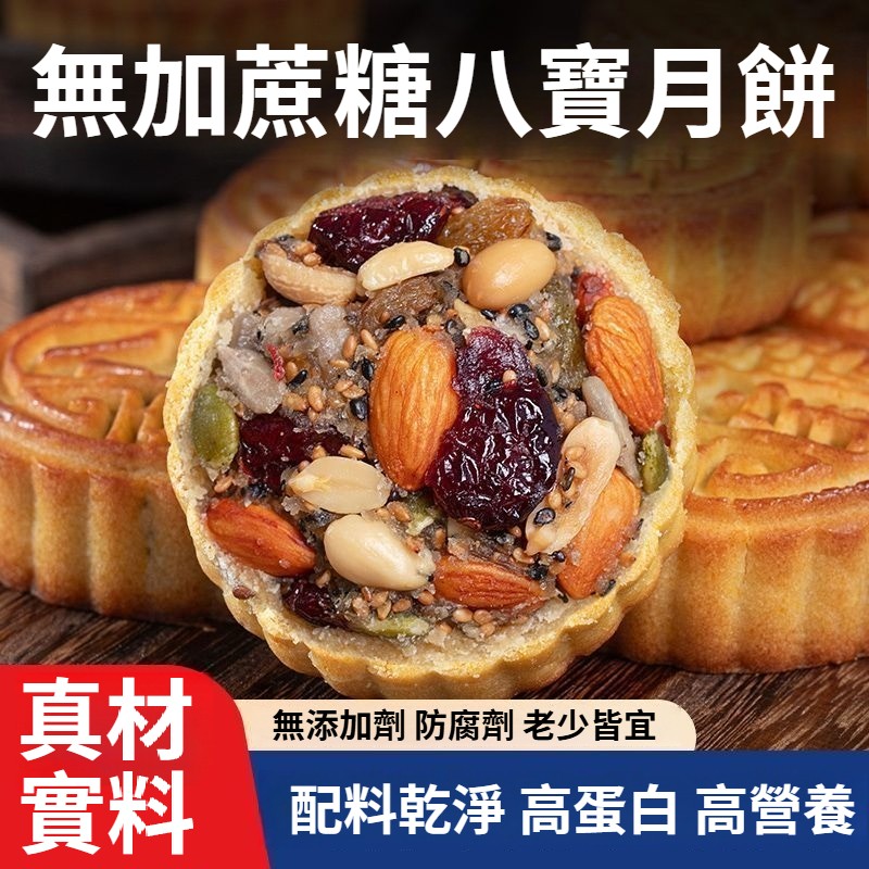 【無蔗糖八寶月餅·健康好吃】真材實料:巴旦木、蔓越莓、葡萄乾、南瓜籽等8種堅果果乾,滿口香濃!零添加更安心:無蔗糖、無防腐劑,配料乾淨,高蛋白高營養,老少皆宜~健康月餅#中秋禮盒#無蔗糖八寶月餅日期新鮮,中秋送禮自用兩相宜!