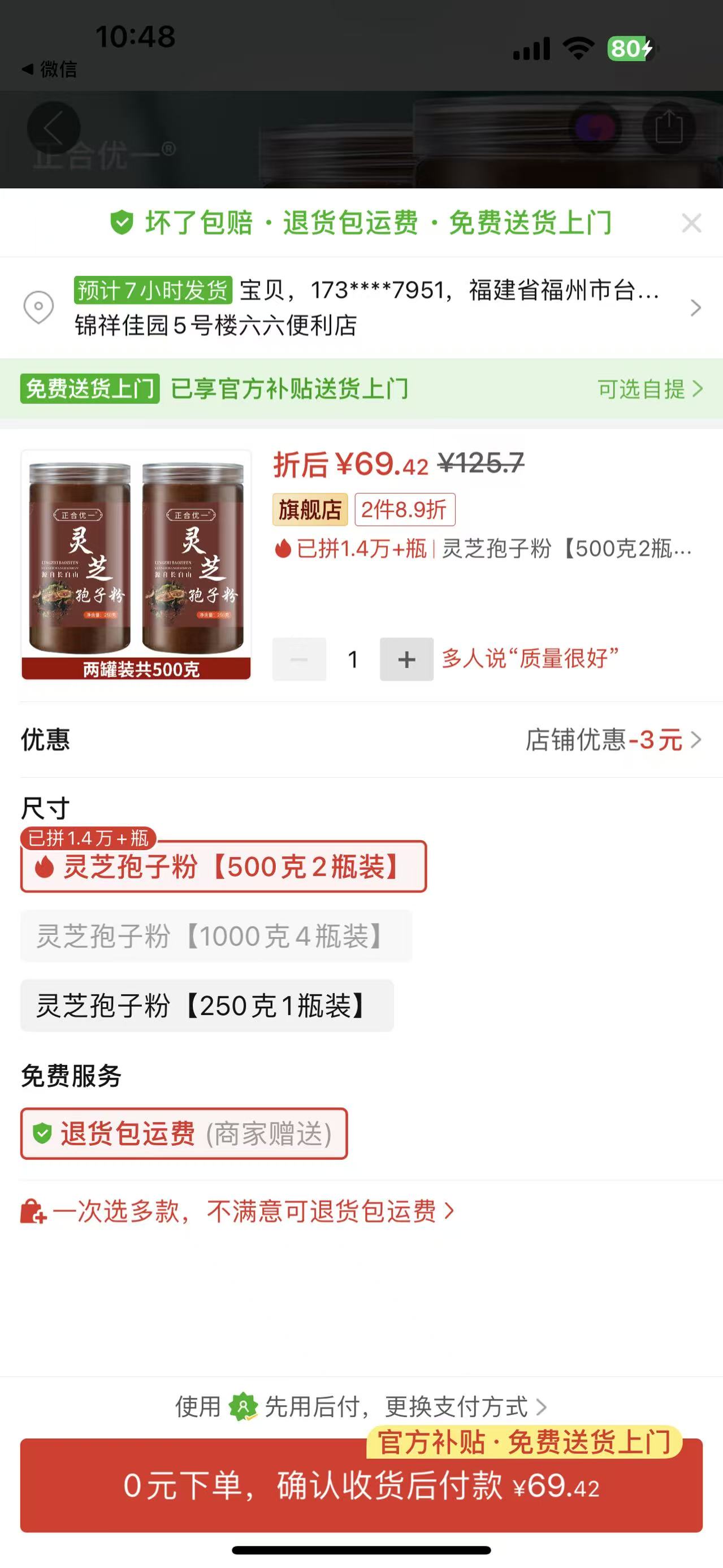 正合優一靈芝孢子粉2瓶