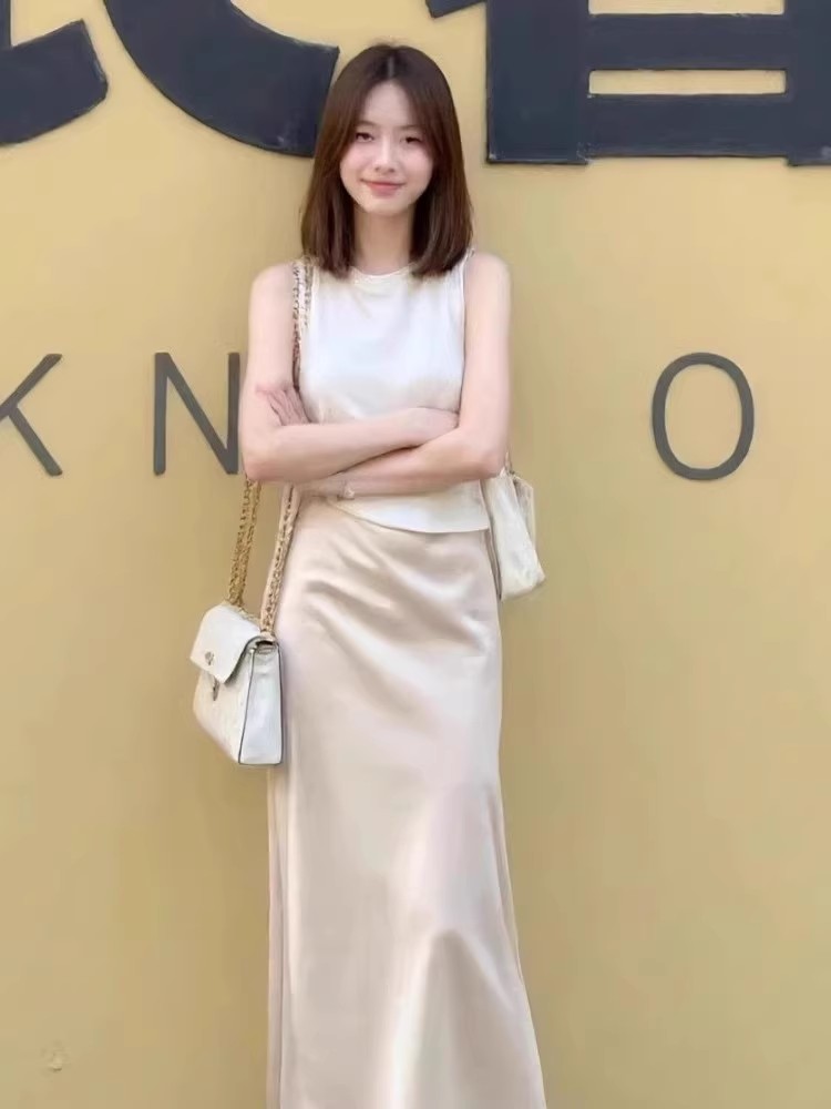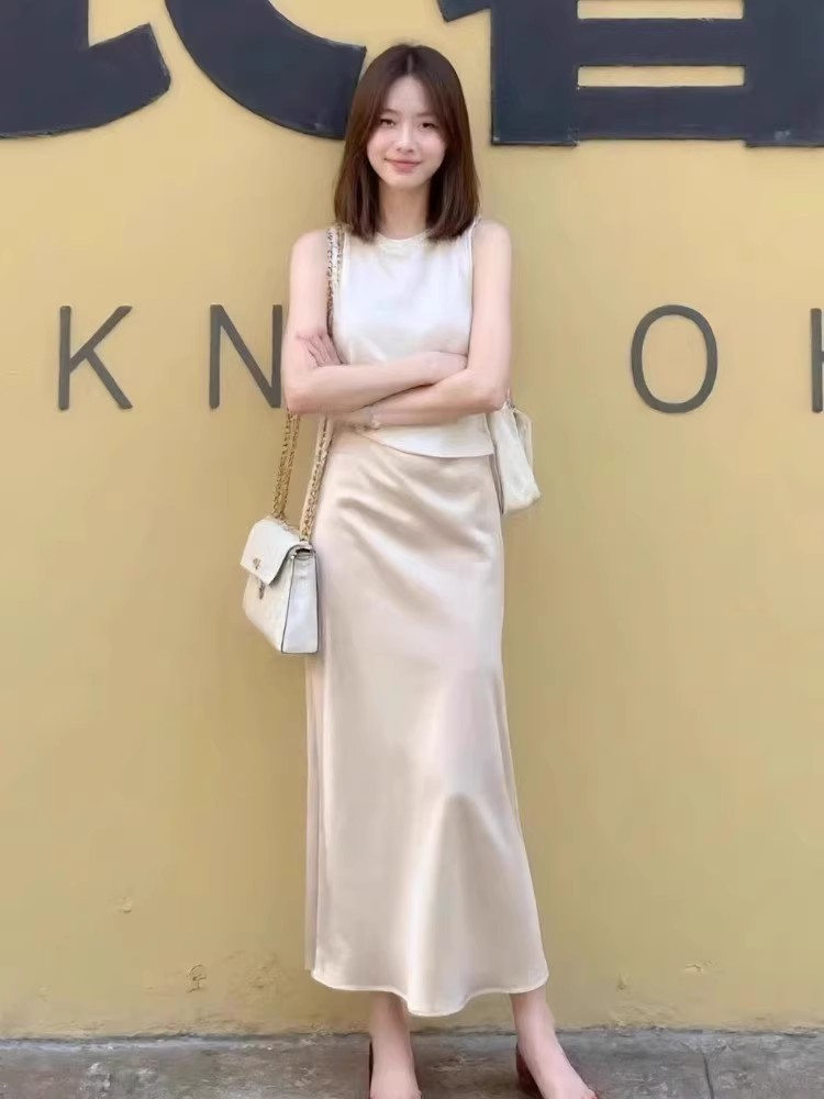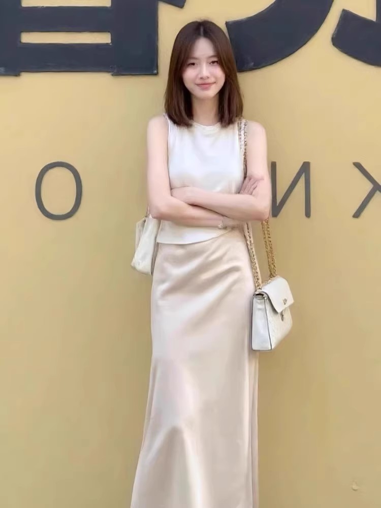 夏季貴氣感禦姐穿搭氣質高級感小香風白色緞面上衣緞面魚尾裙套裝 NT$ 980