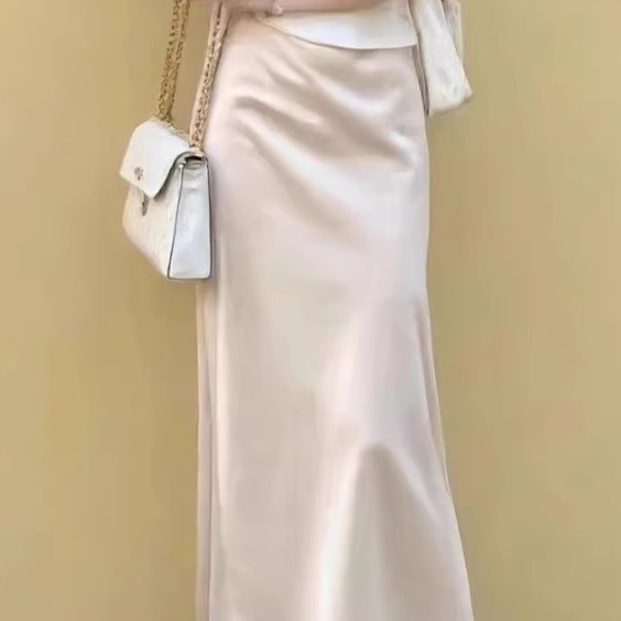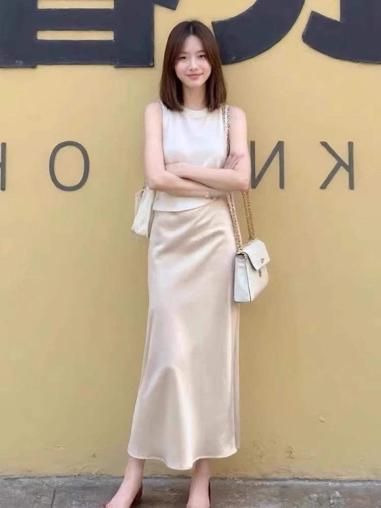 夏季貴氣感禦姐穿搭氣質高級感小香風白色緞面上衣緞面魚尾裙套裝