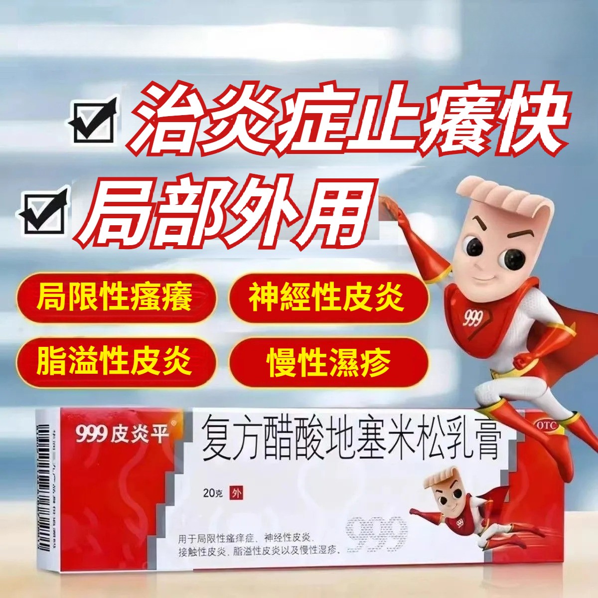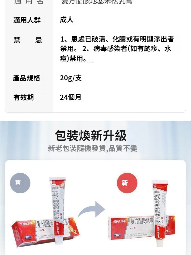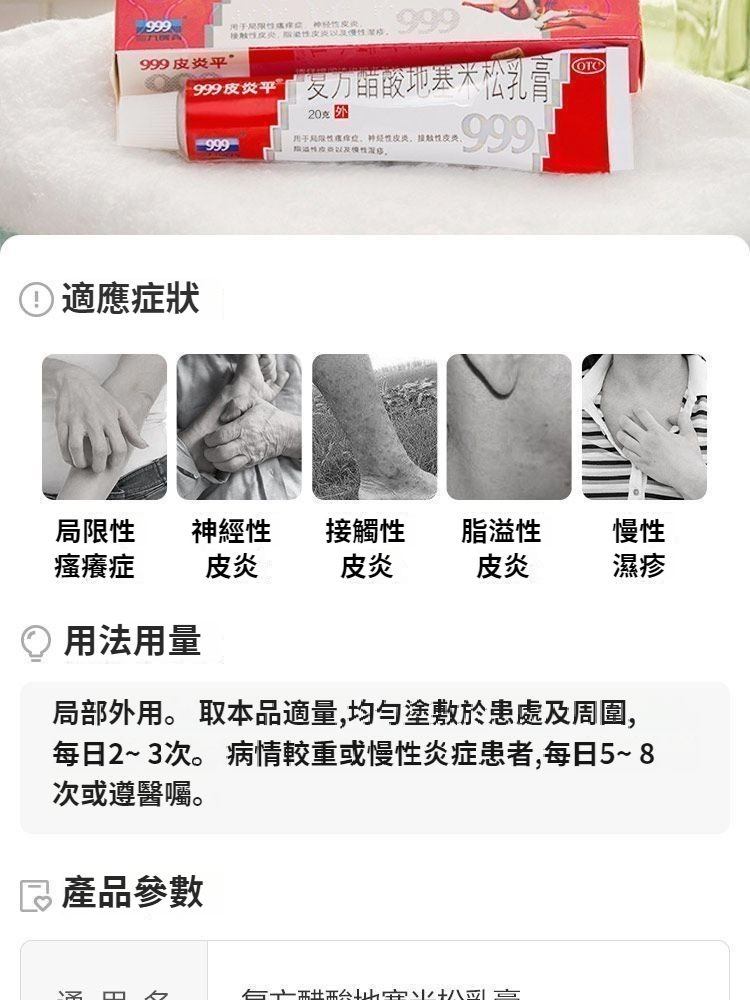 999皮炎平 復方醋酸地塞米松乳膏 】癢到深夜翻來覆去?抓得皮膚精準狙擊局限性瘙癢、神經性皮炎、接觸性皮炎,一抹滲透抗炎,含醋酸地塞米松核心成分,抗炎抗過敏雙效發力,搭配清涼舒緩配方,紅腫癢痛2-3天明顯緩解,日常通勤、居家休息都安心。 NT$ 789