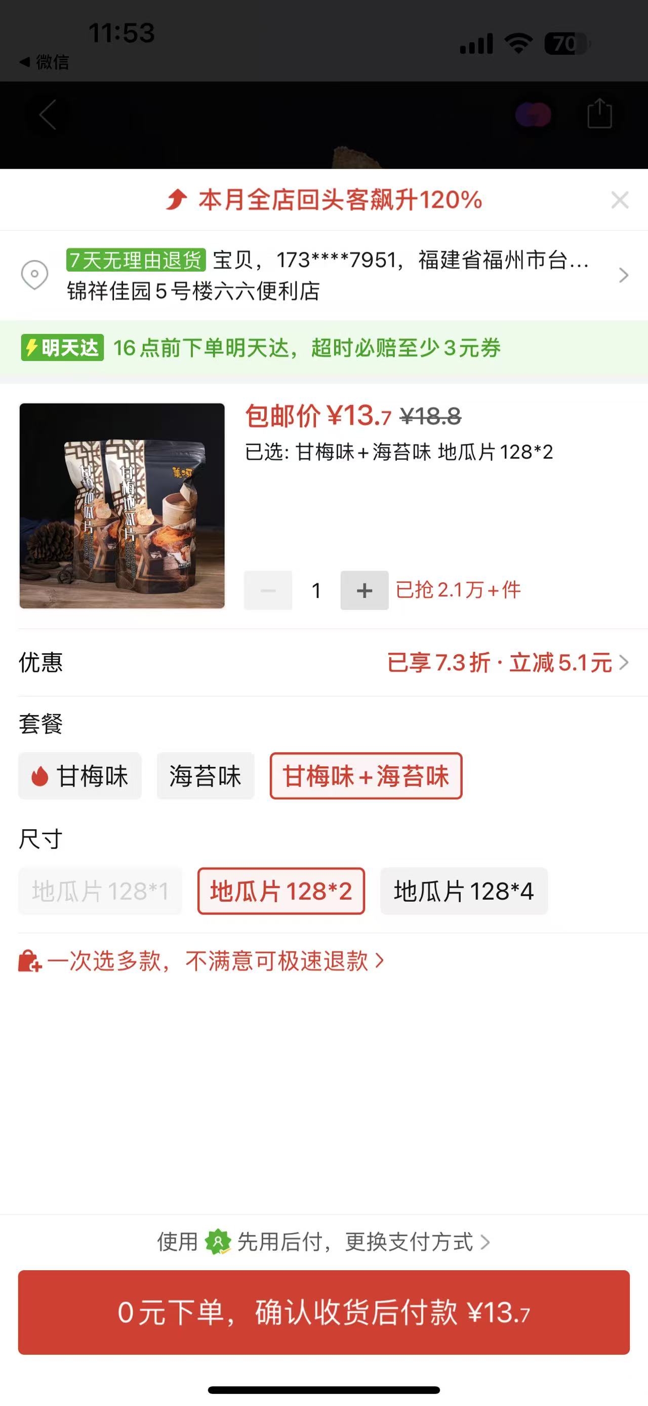 ①甘梅地瓜片甘梅味1袋 海苔味1袋 (13.7元) https://mobile.yangkeduo.com/goods1.html?ps=kg0V4eVLH4