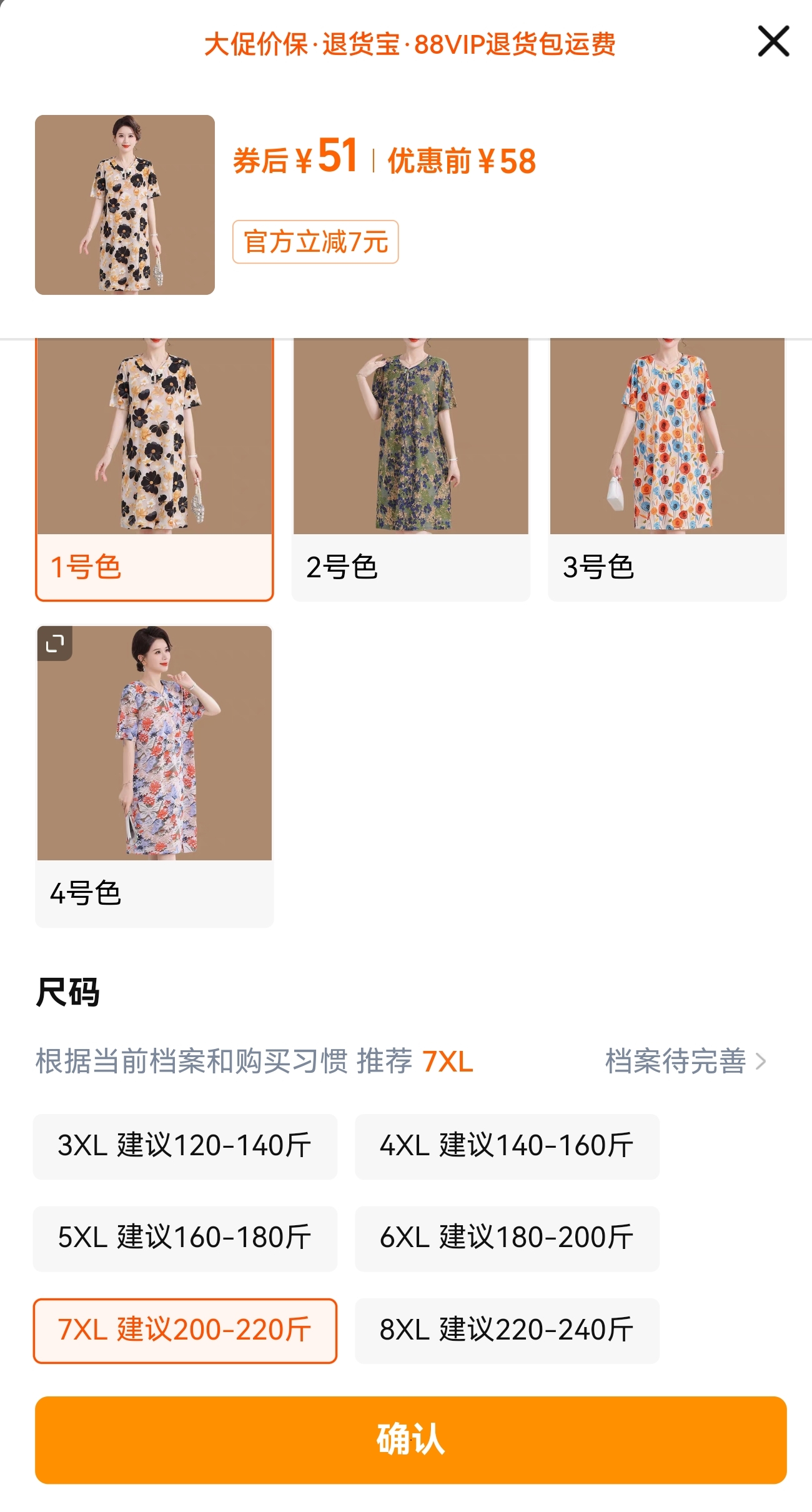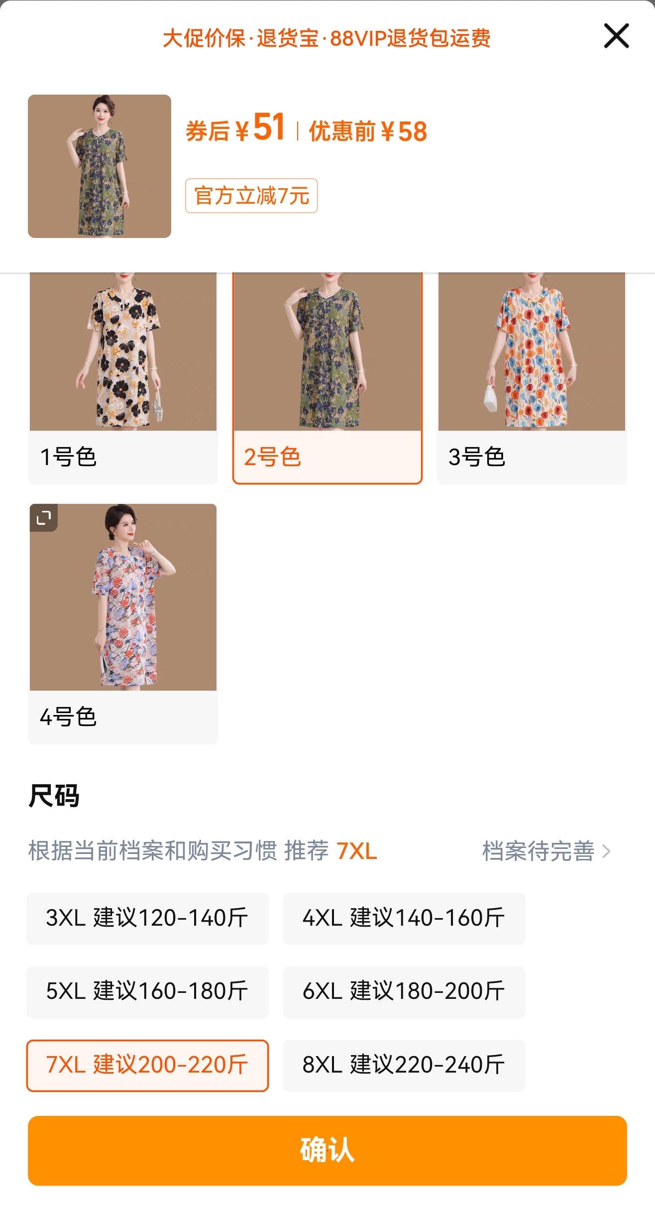 連衣裙2件(1号色 7XL 建议200-220斤)1件 +(2号色 7XL 建议200-220斤)1件 116元