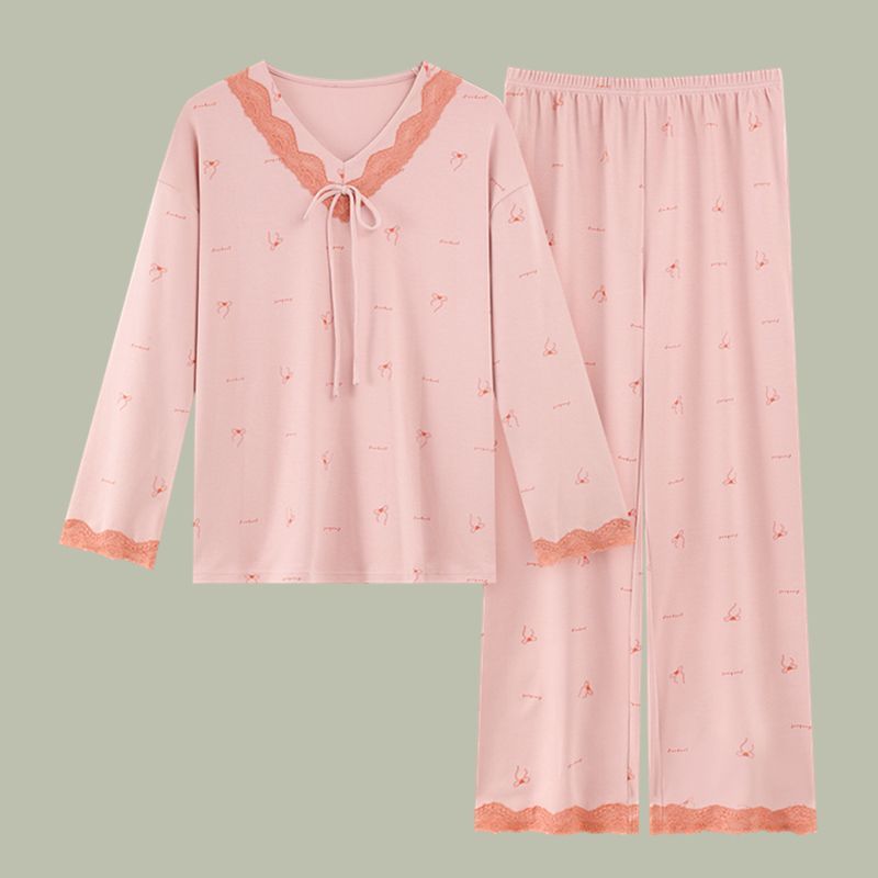 女士純棉睡衣春秋季長袖v領休閒小香風中年可外穿家居服套裝