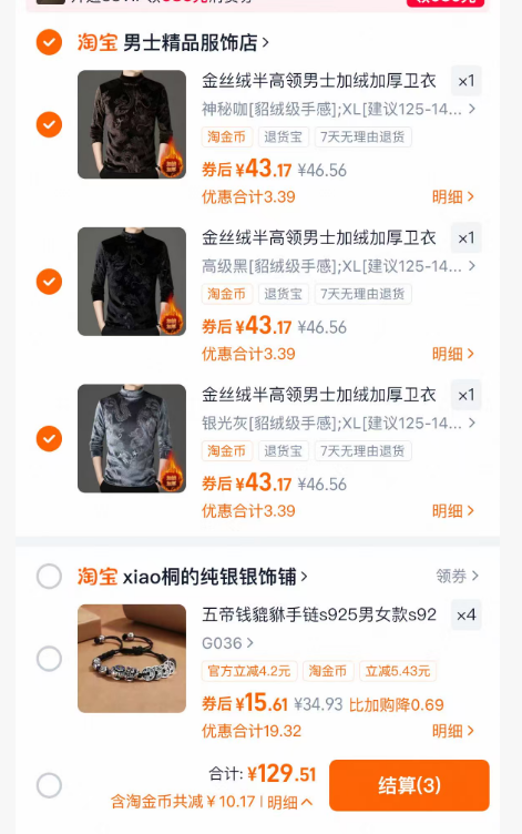 ①金丝绒男士卫衣【XL】 3件(咖色*1、黑色*1、灰色*1)