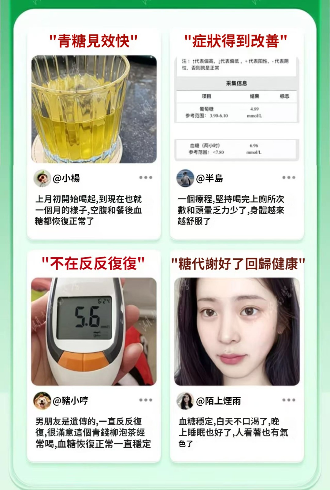 青錢柳茶-大自然的恩賜。被譽為醫學界認可的「天然胰島素」。其富含的皂苷、黃酮、多醣等稀有成分,可有效促進胰島β細胞分泌胰島素,並改善胰島素阻抗,幫助您身體恢復自身的血糖調節能力,從源頭實現平穩控製糖。 · 口感:味甜,有獨特的草本清香。 · 飲用建議:可單獨沖泡,也可搭配桑葉、玉米鬚等。