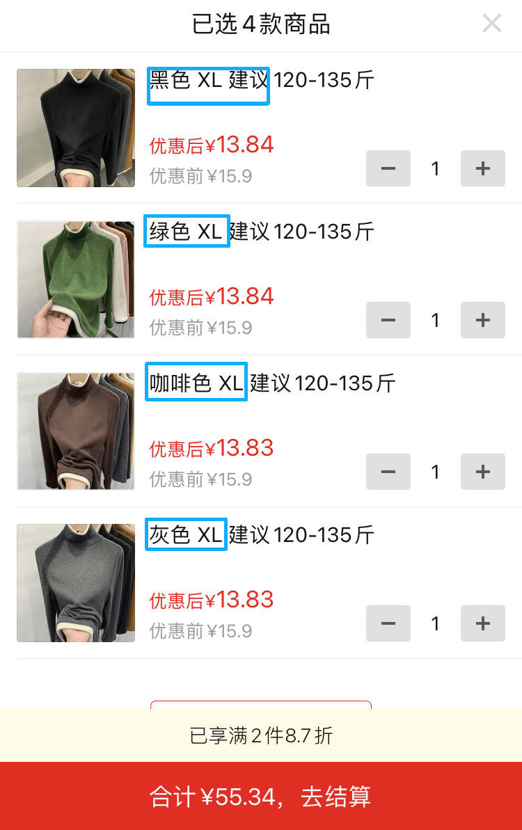 共4件 XL碼 德絨假兩件高領長袖(黑色1件+綠色1件+咖啡色1件+灰色1件);採購價:55.34元