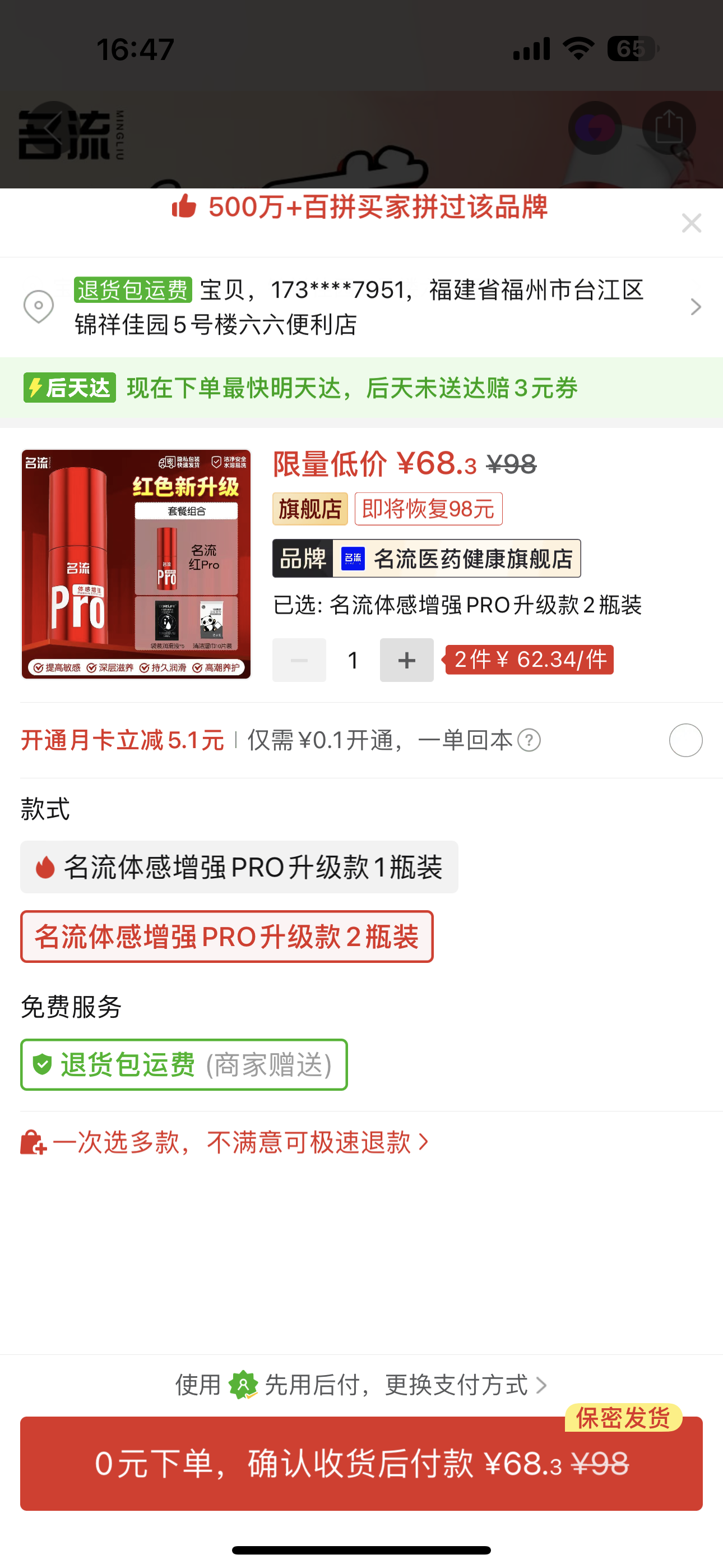 ①名流體感增強pro快感液2瓶 原價68.3元,下單商家給優惠5元,63.3元https://mobile.yangkeduo.com/goods2.html?ps=DaCLVZ6Cu5