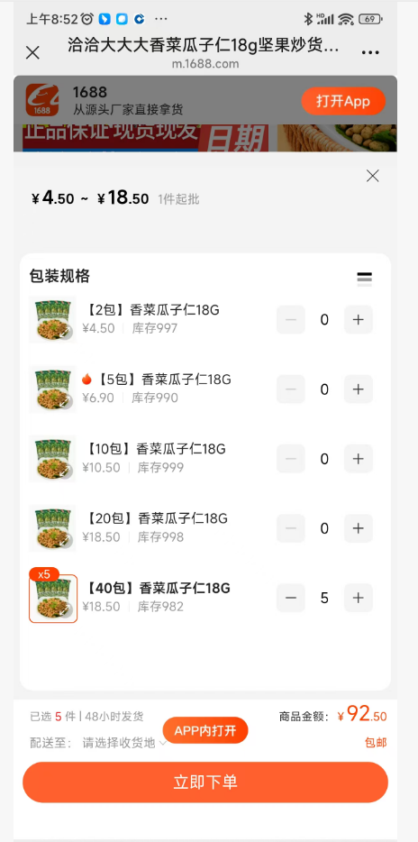 香菜瓜子仁200包(拍40包*5組)92.5元【洽洽大大大香菜瓜子仁18g坚果炒货袋装办公室休闲解馋零食品批发】复制¥1pOFX4s64Cbau¥,打开【手机阿里】或【支付宝-点首页进行搜索】查看:https://qr.1688.com/s/zbKlwj2l CZ0352