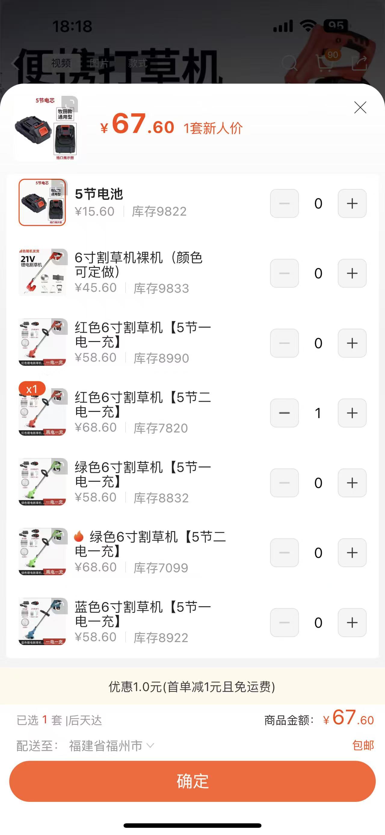 ①割草機紅色6寸5節二電一充1臺+②露營箱1個62L