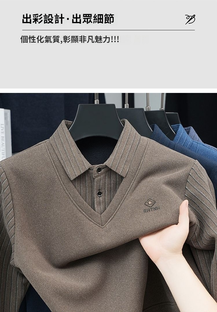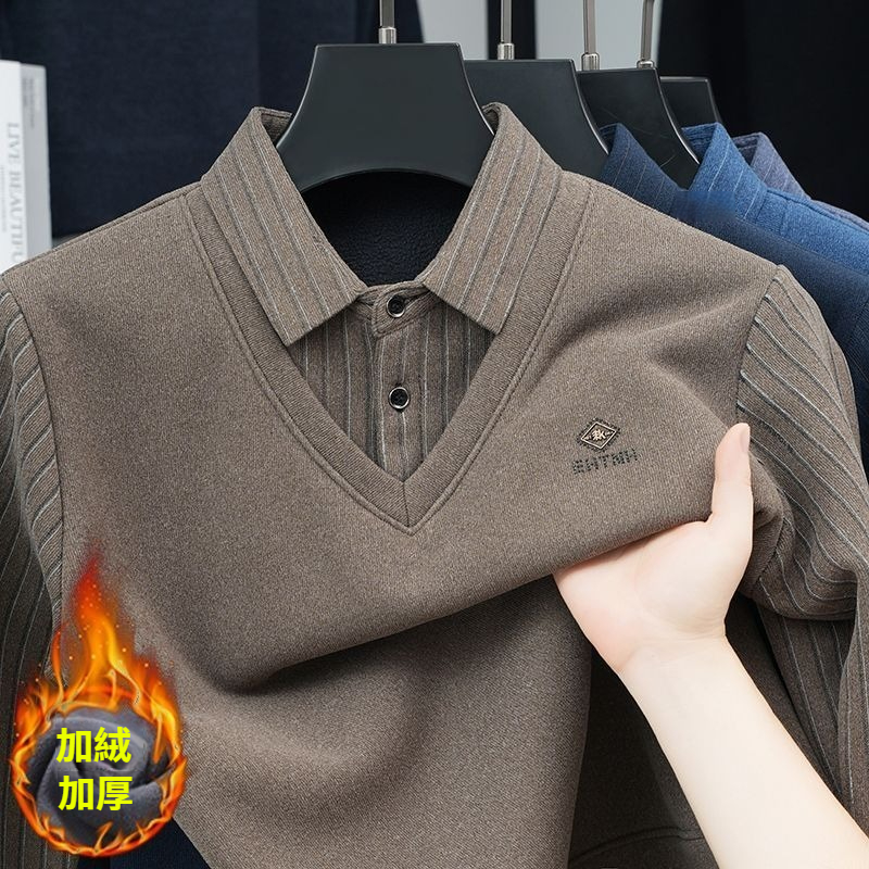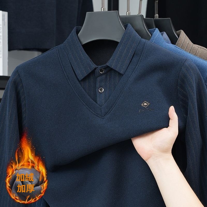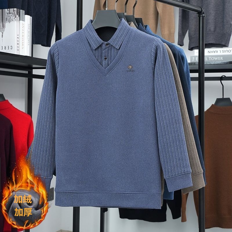 第 1 件 : 加絨加厚冬季男士上衣假兩件毛衣翻領襯衫打底爸爸保暖休閒針織衫
