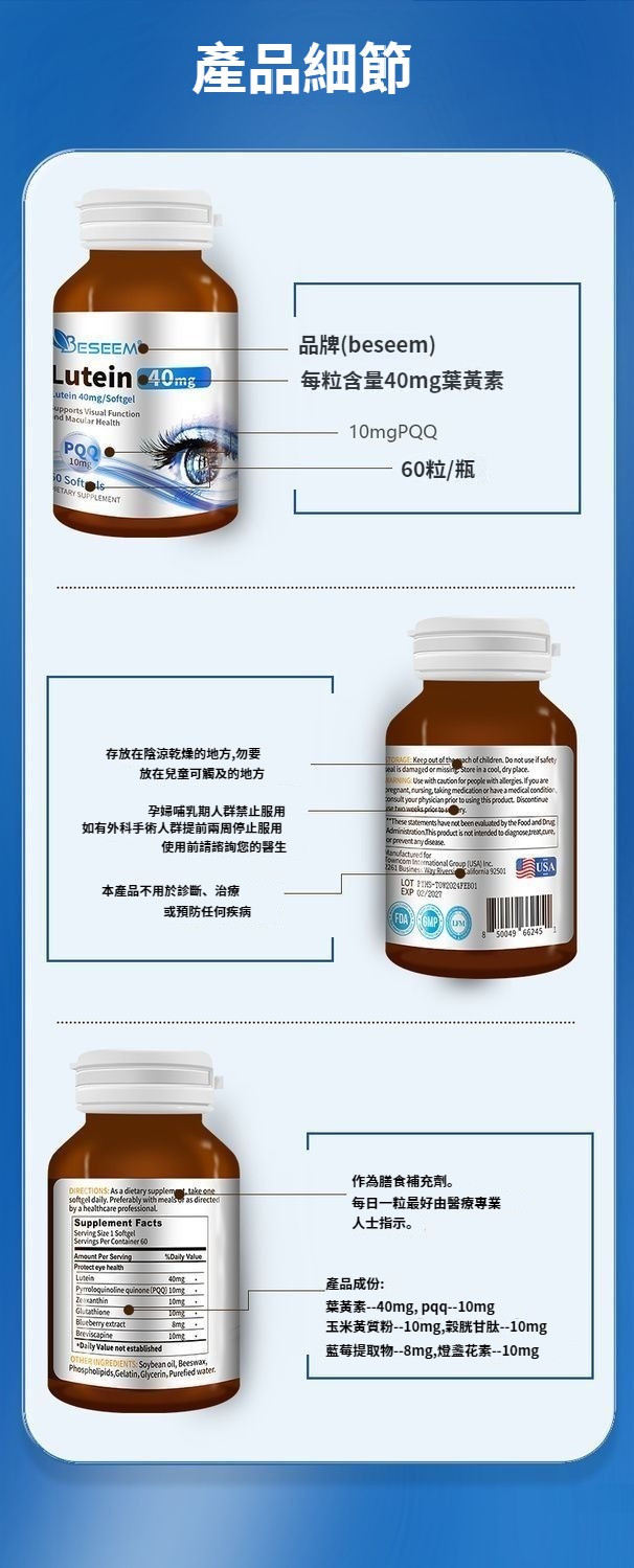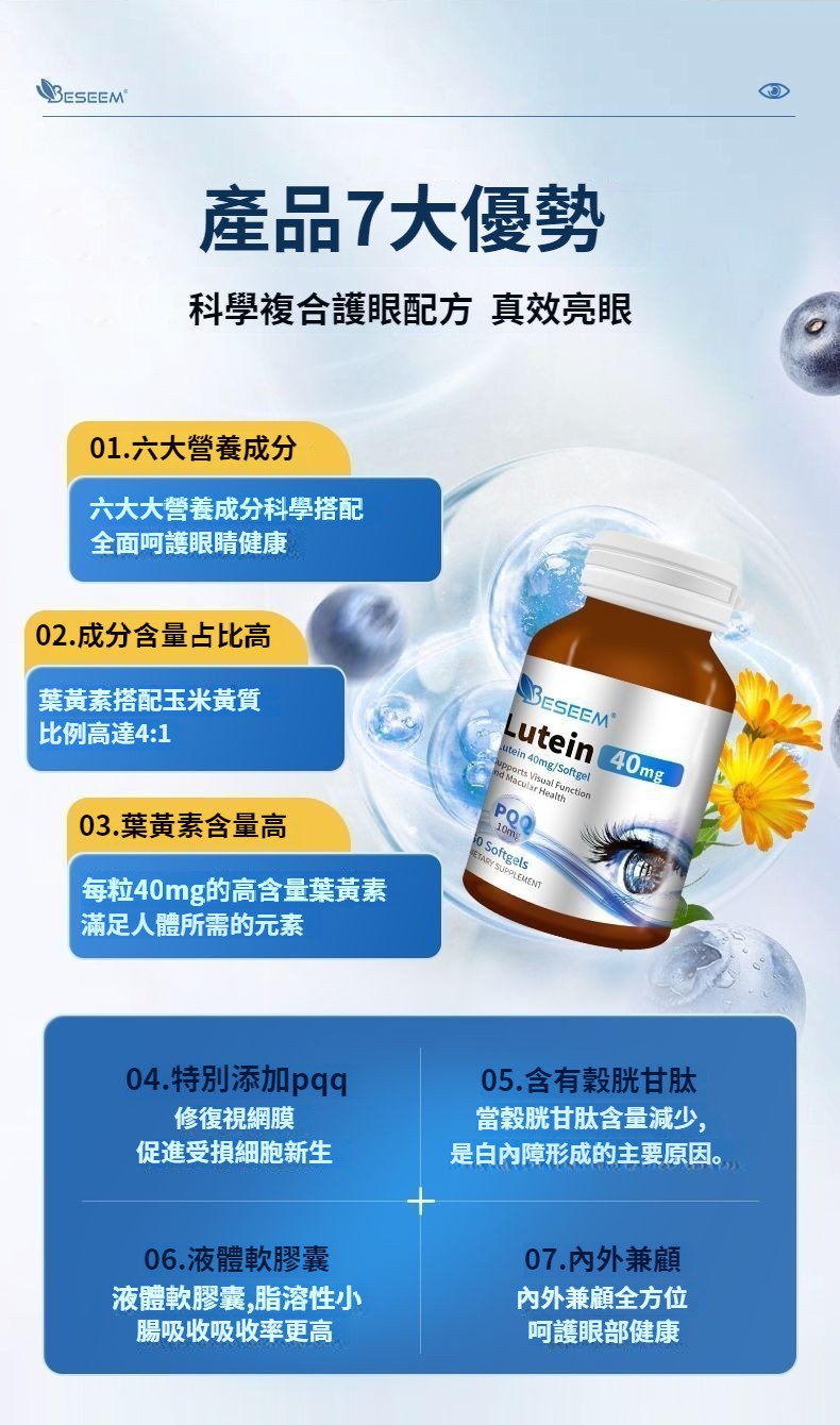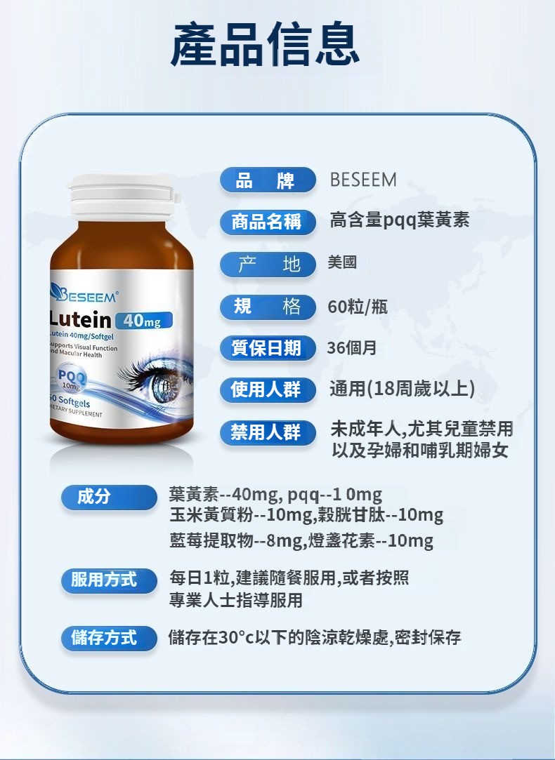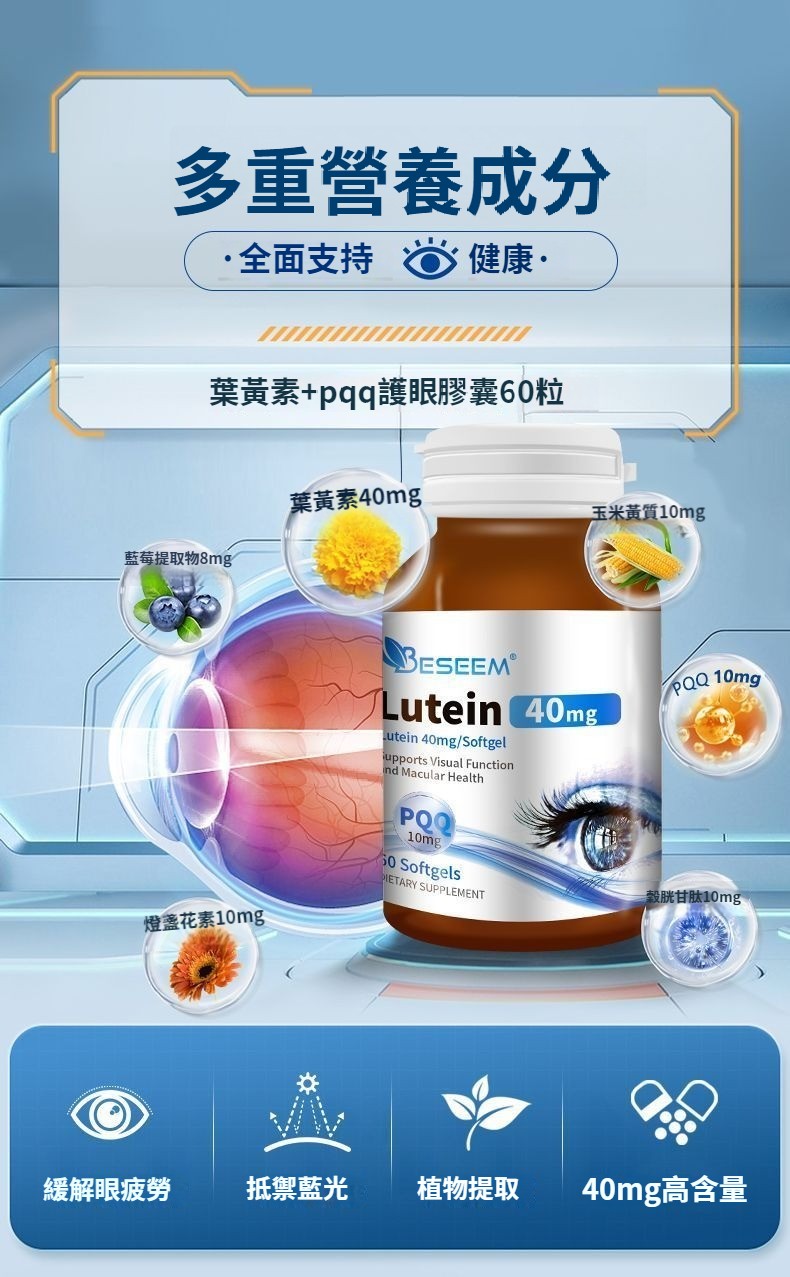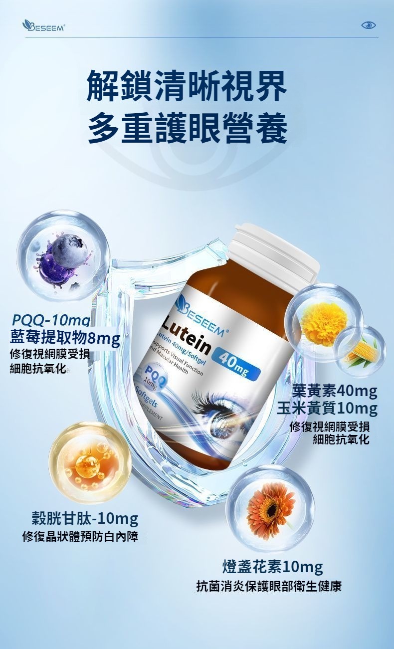 美國原裝進口高含量葉黃素40mg+PQQ10mg藍莓護眼軟膠囊緩解眼疲勞 NT$ 1399