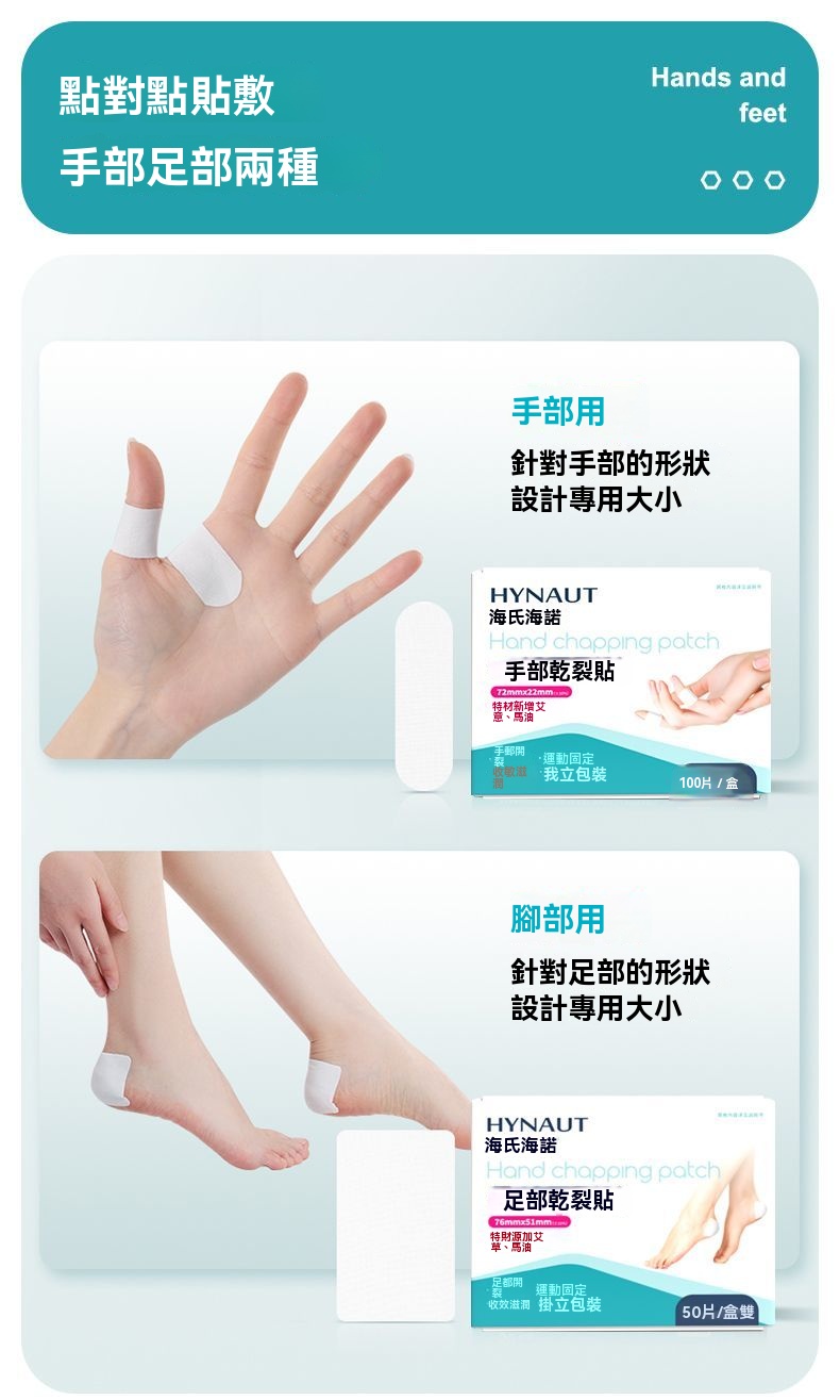 【手足皲裂修護貼】 馬油潤養|改善乾裂粗糙、 凡士林鎖水|不再反覆裂、 貼合裂口|行走也不易脫落、 居家、上班、睡前都能用、 NT$ 998
