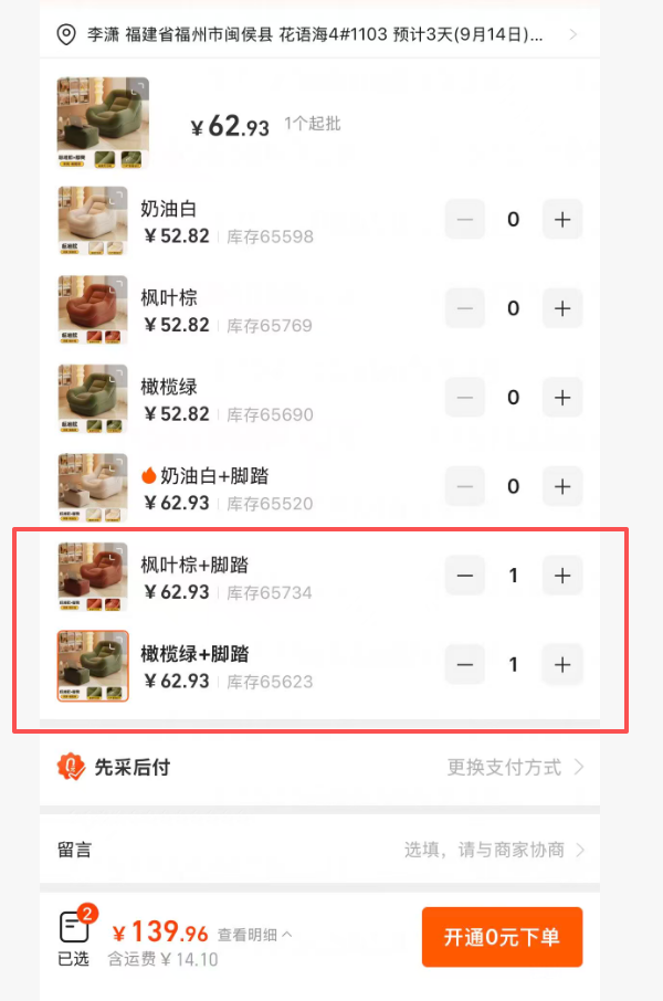 ①懒人沙发 2套(枫叶棕+脚踏 1套、橄榄绿+脚踏 1套)