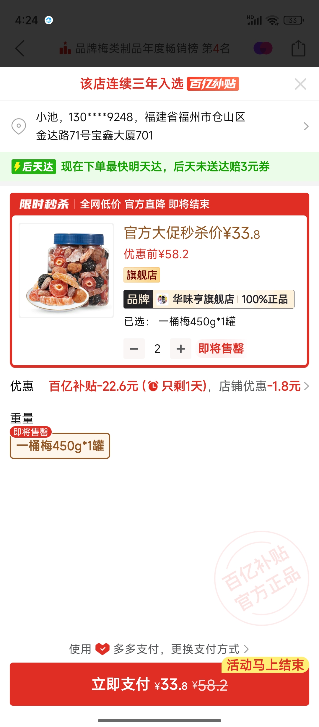 ① 一桶梅 450克 訂2罐 (33.8 $)