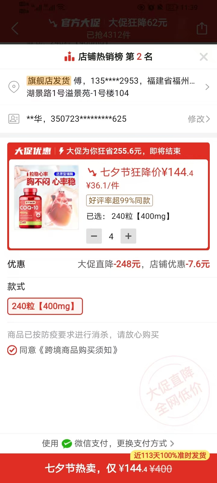 美国直邮进口加强版400mg还原型辅酶Q10*4瓶