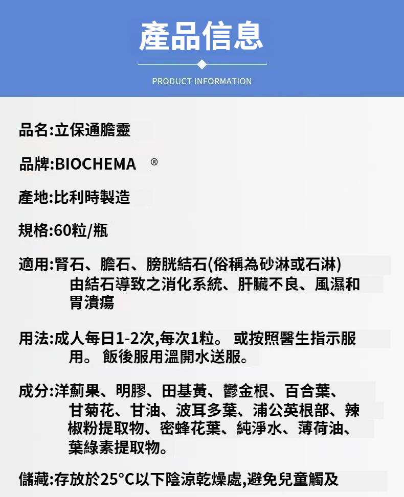 原進口比利時BIOCHEMA立保通膽靈利膽消石腎石膽石膀胱結石 NT$ 1490