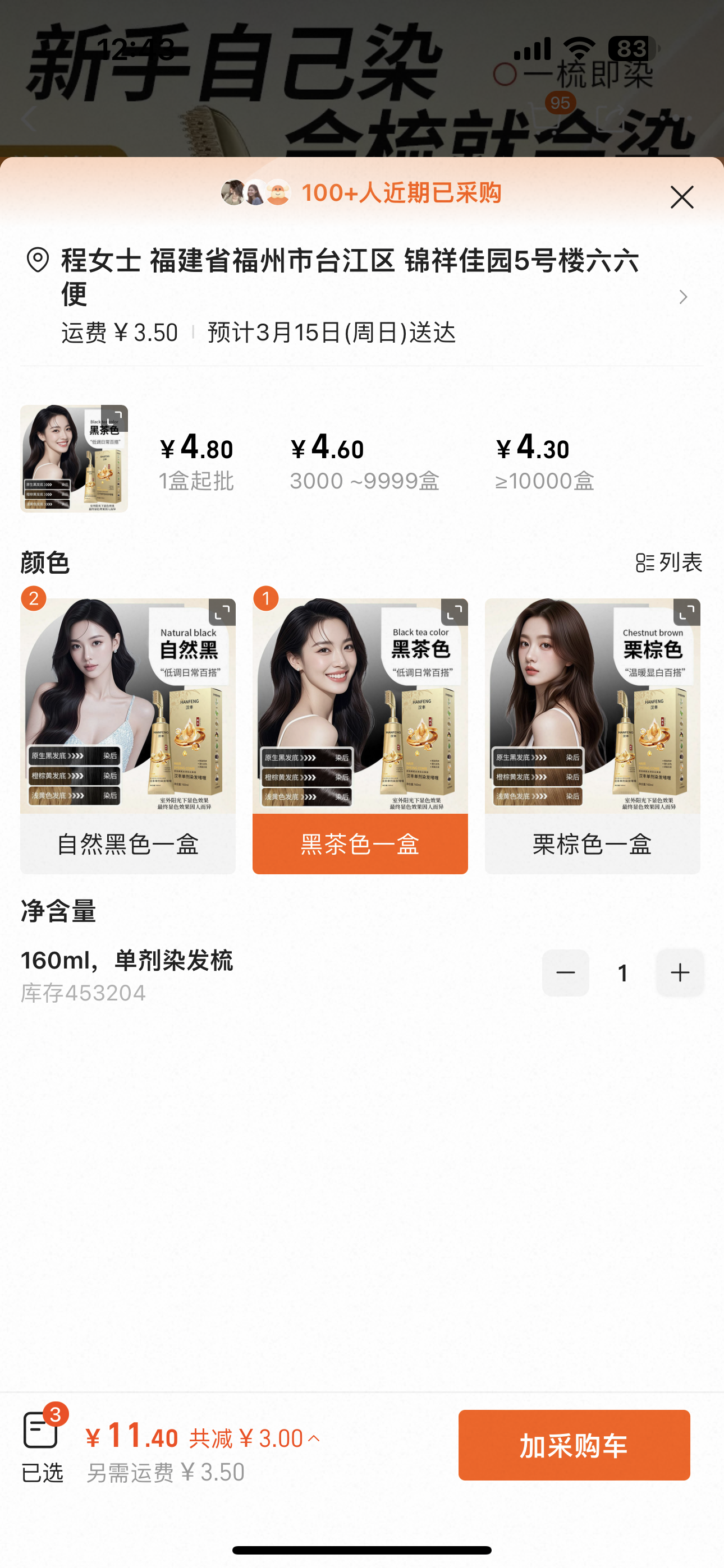 北柔盈潤植萃單劑染髪梳自然黑色2盒+黑茶色1盒