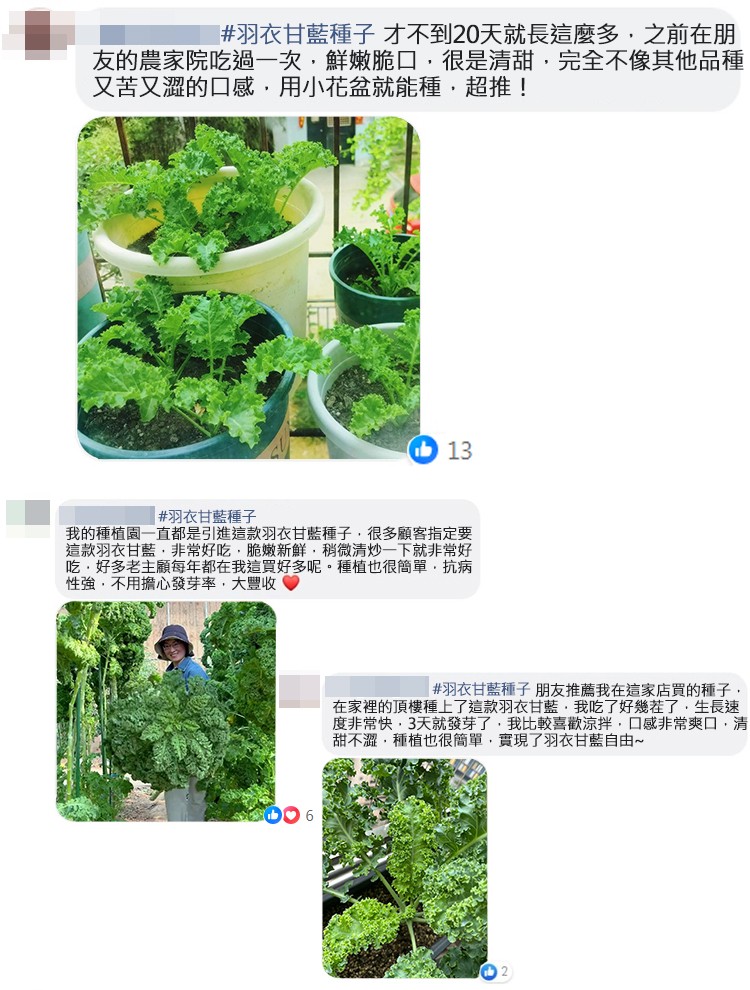 李先生:平常就是愛健身,因此經常吃減脂餐,聽說羽衣甘藍很適合健身期吃,但是我在商超買的羽衣甘藍成品,口感非常差,不好吃,就找了很久看到這家店主推的羽衣甘藍種子,就買回來試試看自己種。