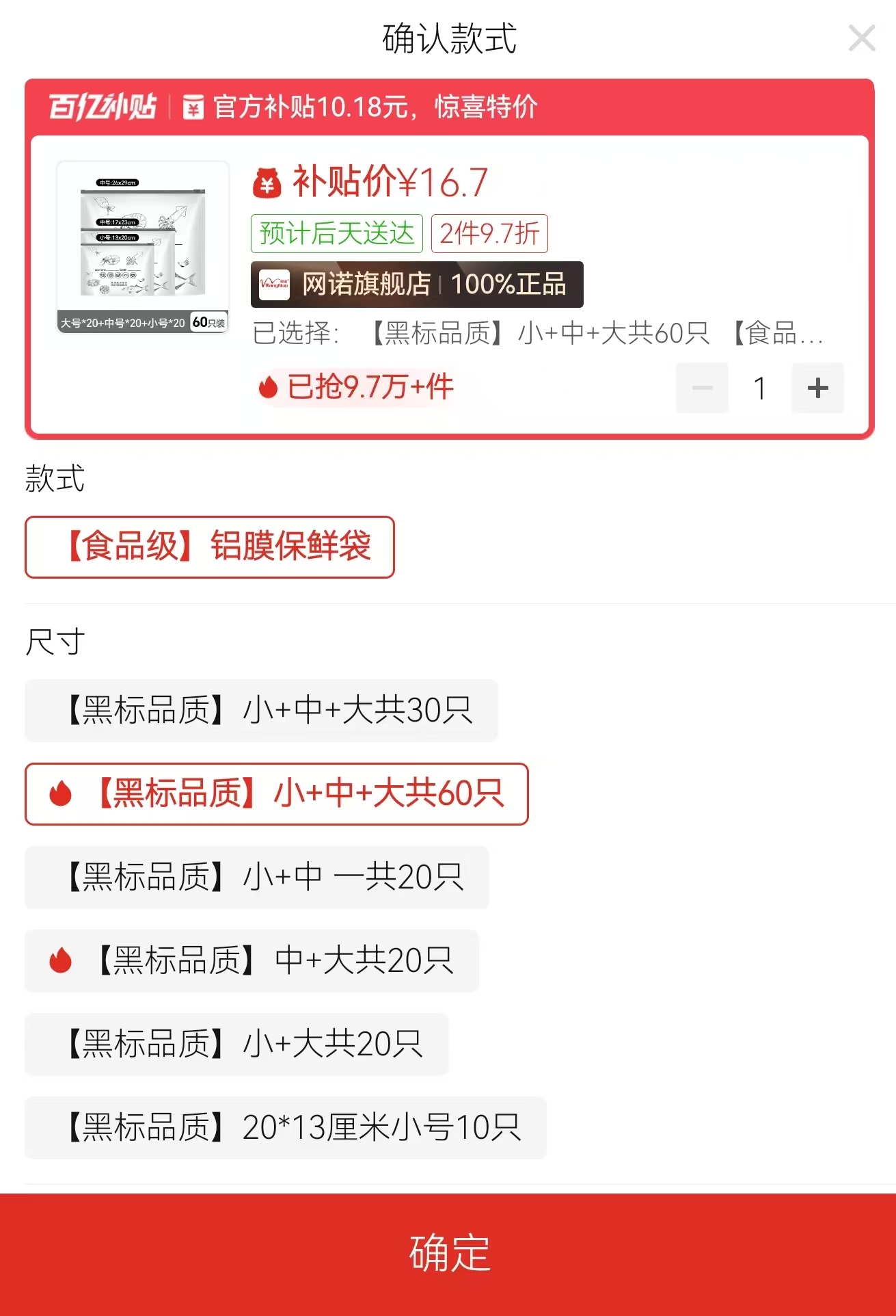 ②鋁箔保鮮袋(小+中+大共60只)16.7元 https://mobile.yangkeduo.com/goods.html?ps=lgxXXSfhQc