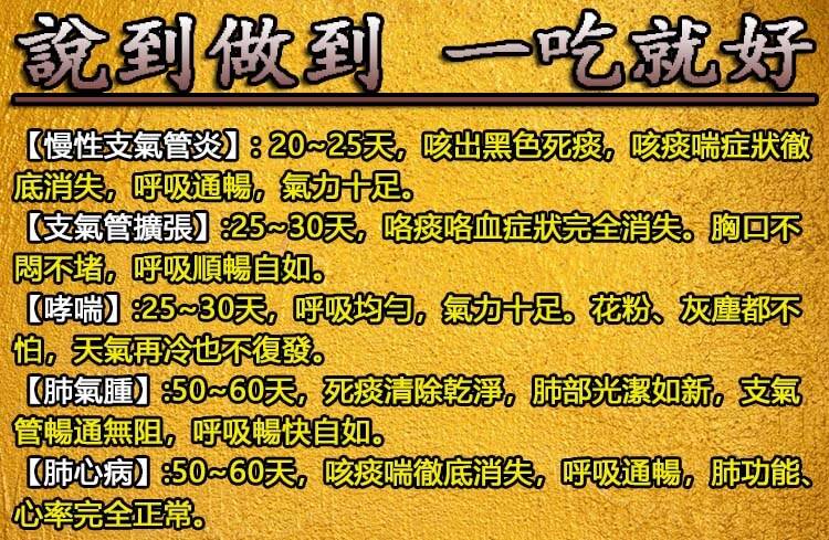 注意:本產品已經三軍總醫院、臺北榮民總醫院等多家權威機構臨床驗證:對惡重頑固性咳喘老病具有獨特療效,一般患者服用當天即能明顯消除或緩解劇烈咳嗽哮喘、胸痛胸悶氣短、呼吸困難等症狀;10 —15天,粘痰、膿痰咳出咳血完全消失,絕大部分患者短短一個月即臨床康復,堅持鞏固治療60天以上,幾年、幾十年的老咳喘病都能得以康復。
